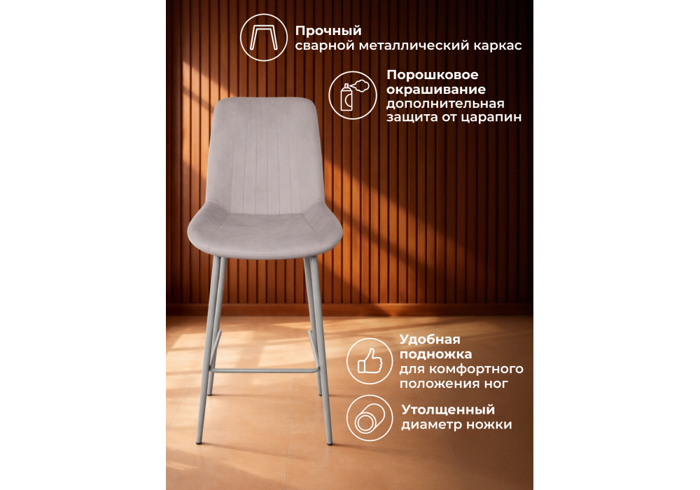 Материал каркаса - металл; Материал сиденья - велюр; Материал обивки - велюр; Цвет ножек - серый; Ширина - 49; Глубина - 57; Высота - 102; Ширина сиденья - 47; Глубина сиденья - 41; Высота сиденья - 63;