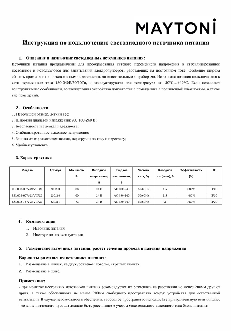 ОтлОтличная модель 220210 от немецкого mпроизводителя Maytoni предназначена для работы светодиодной ленты, мощность блока 60 Вт. Размеры устройства составляют 30 мм х 320 мм. Блок питания имеет алюминиевую арматуру серебристого цвета. Размещение источника питания возможно в нишах, на двухуровневом потолке, скрытых лючках, а также в щите. При монтаже нескольких источников питания рекомендуется их размещать на расстоянии не менее 200мм друг от друга, а также обеспечивать не менее 200мм свободного пространства вокруг устройства для естественной вентиляции. В случае невозможности обеспечить свободное пространство используйте принудительную вентиляцию. Сечение питающего провода должно быть рассчитано с учетом максимального выходного тока блока питания. Небольшой размер, легкий вес, а также широкий диапазон напряжений: AC 180-240 В, делают данную модель незаменимым помощником при создании освещения в вашем интерьерном пространстве. Техническими особенностями являются защита от короткого замыкания, перегрузки по току и перегреву. Блок питания для светодиодной ленте Maytoni 60Вт 24В 220210 - это качественное и надежное устройство. Данную модель всегда можете купить в интернет-магазине 220svet.