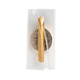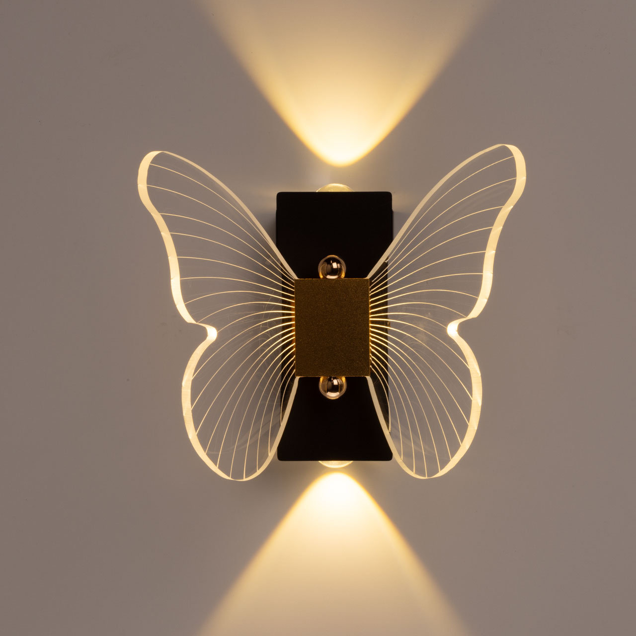 Металлический корпус настенного бра окрашен в черный цвет. Корпус плафона выполнен из сплава алюминия и окрашен в цвет золота. Настенное бра декорировано изящным элементом из прозрачного акрила в виде крыльев бабочки с линейной фактурой.