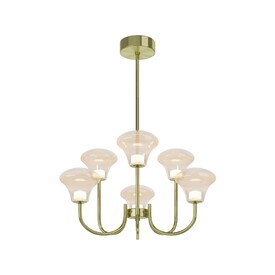 Серия Dynasty вдохновлена атмосферой бальных залов и представлена подвесными светильниками (люстры) на 6 и 8 плафонов, настенным светильником (бра). Обтекаемая форма плафона с градиентом от янтарного к прозрачному. Арочный дизайн металлической арматуры в цвете сатинированной латуни. Блеск металла и глянец стекла дополнены светом LED-источника (3000K). Высота люстр регулируется разборной штангой. Светильники Dynasty станут ярким акцентом в гостиной, столовой, спальне, рабочем кабинете или прихожей.