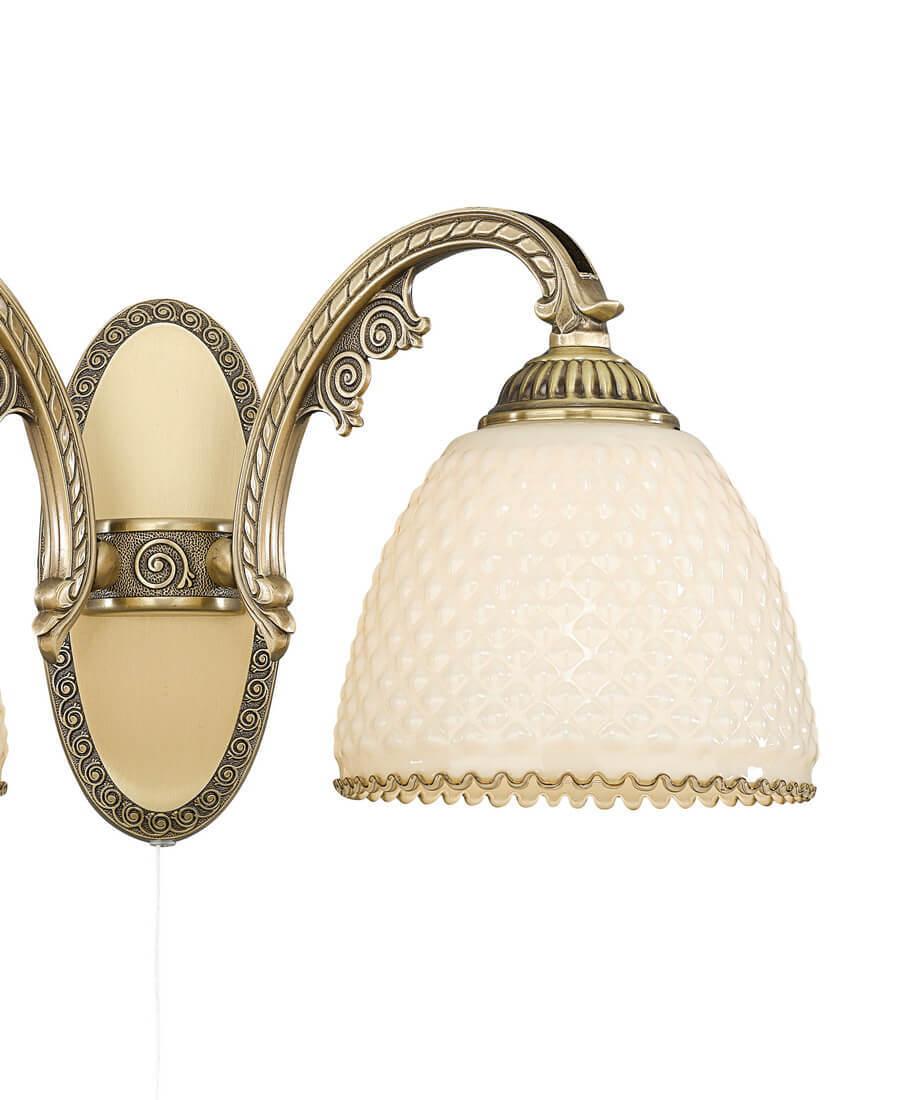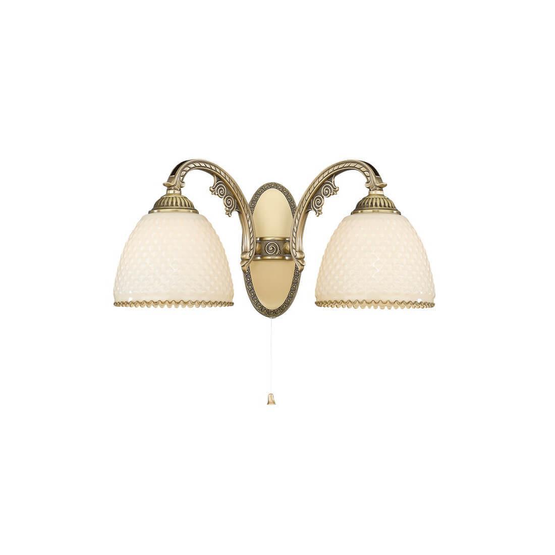 Бра Reccagni Angelo A 7005/2 Итальянского производсва – уникальное сочетание высокого качества и удивительных фактур. Этот светильник Классического стиля хорошо подойдет Для гостиной и придаст помещению мягкий и приятный свет. Плафоны белые из стекла. Арматура бронза из металла. Кол-во ламп - 2шт. Общая мощность 120W