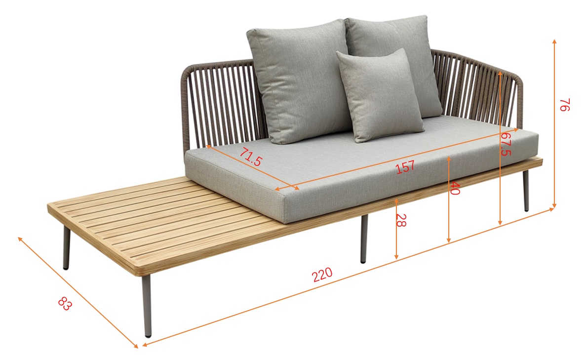 Уличный диван изготовлен из устойчивых к погодным условиям материалов. Cъемные подушки выполнены из специальной уличной ткани с водоотталкивающими свойствами OLEFIN тайваньского производства. Светлая ткань не будет сильно нагреваться на солнце и выцветать. Каркас из алюминия декорирован в цвет дерева, подлокотники и спинка оплетены декоративным шнуром. Особенность дивана в том, что сиденье не полностью закрывает основание, есть возможность сервировать закуски и напитки, либо положить полотенце и принадлежности для купания. Эта модель выпускается в правом и левом исполнении. В комплект входит подушка сиденья 12см, 2 подушки спинки и 1 декоративная квадратная подушка. Габариты сиденья: ширина 157см, глубина 71,5см, высота от пола 40 см, высота подлокотника от сиденья 27см. Сочетается с уличным креслом 129KN-03041, диванами 129KN-03042, 129KN-03047 и кофейными столиками 129KN-01430, 129KN-00620.