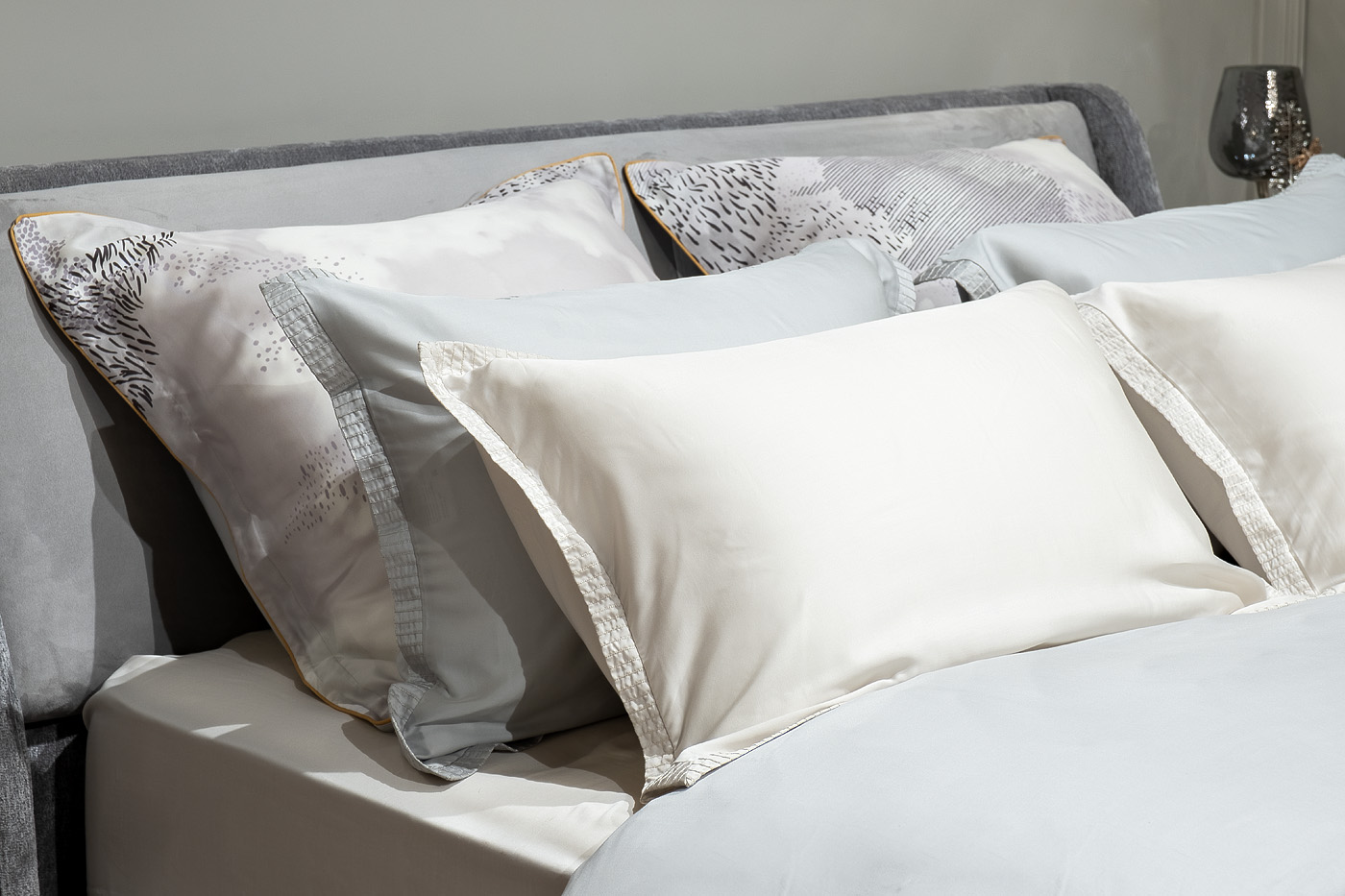 Комплект наволочек с клапаном сшит из 100% ткани тенсель. По периметру наволочки уникальная вышивка в цвет ткани, формирующая бордюр шириной 3 см. Ткань изготовлена из экологически чистого волокна лиоцелл, полученного из древесины эвкалипта. Ткань мягкая, немного блестящая, как шелк, но при этом – не скользкая и легкая, как хлопок. Она отлично пропускает воздух и впитывает влагу, гипоаллергенна. Уход: Деликатная машинная стирка при температуре не выше 30 градусов. При использовании утюга устанавливать режим «шелк» и гладить с изнаночной стороны. Стирать в стиральной машине можно, но только в режиме деликатной стирки и отжима. Не рекомендуется использовать стиральный порошок, только жидкие моющие средства. Полоскание возможно только в холодной воде.