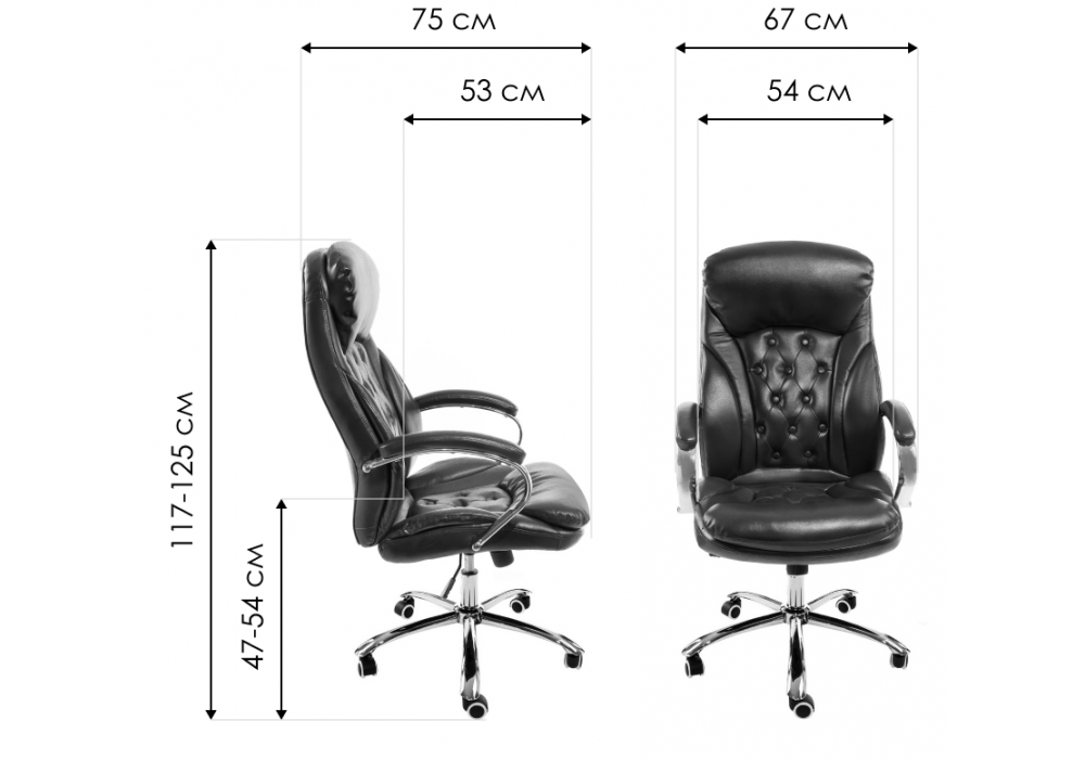 Материал каркаса - металл; Материал сиденья - экокожа; Материал обивки - экокожа; Ширина - 67; Глубина - 75; Высота - 117; Ширина сиденья - 54; Глубина сиденья - 53; Высота сиденья - 47; Высота спинки - 70; Высота максимальная - 125;