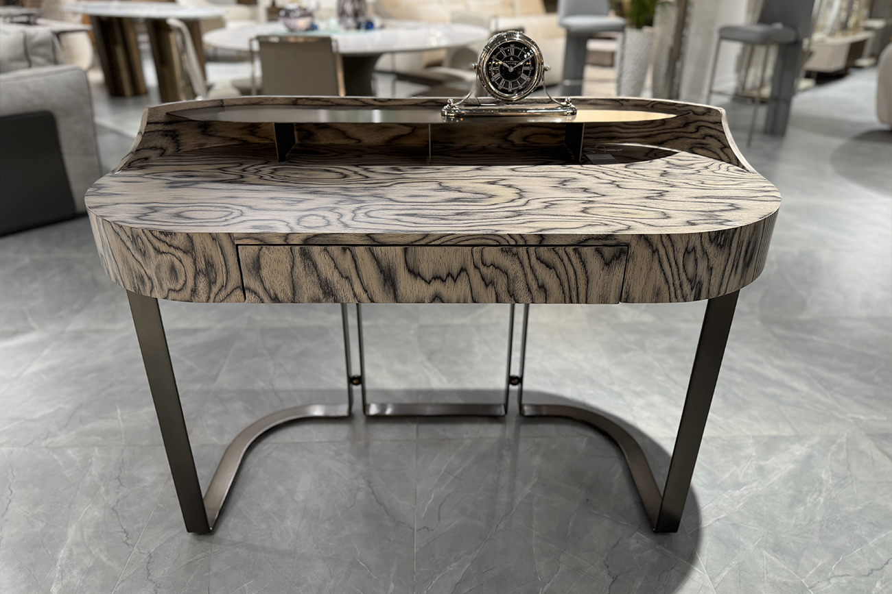 Консоль светлый шпон — изящный акцент для современного интерьера, где важны пропорции и благородные материалы. Эта консоль из светлого шпона привлекает выразительной текстурой древесины и мягкими округлыми линиями, создающими ощущение визуальной лёгкости. Тонкое металлическое основание подчёркивает архитектурный силуэт и добавляет конструкции устойчивость без утяжеления образа. Дизайнерская консоль в светлом шпоне гармонично вписывается в интерьеры в стиле modern luxury, современная классика и минимализм, дополняя пространство элегантным и функциональным элементом.