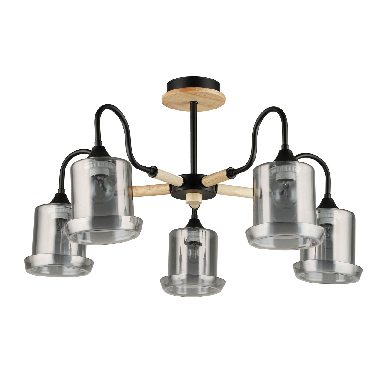 Металлическое основание потолочной люстры окрашено в черный цвет. Стеклянные плафоны отлиты в оригинальную форму и гальванизированы в дымчатый цвет. Потолочная люстра декорирована элементами из натурального светлого дерева.
