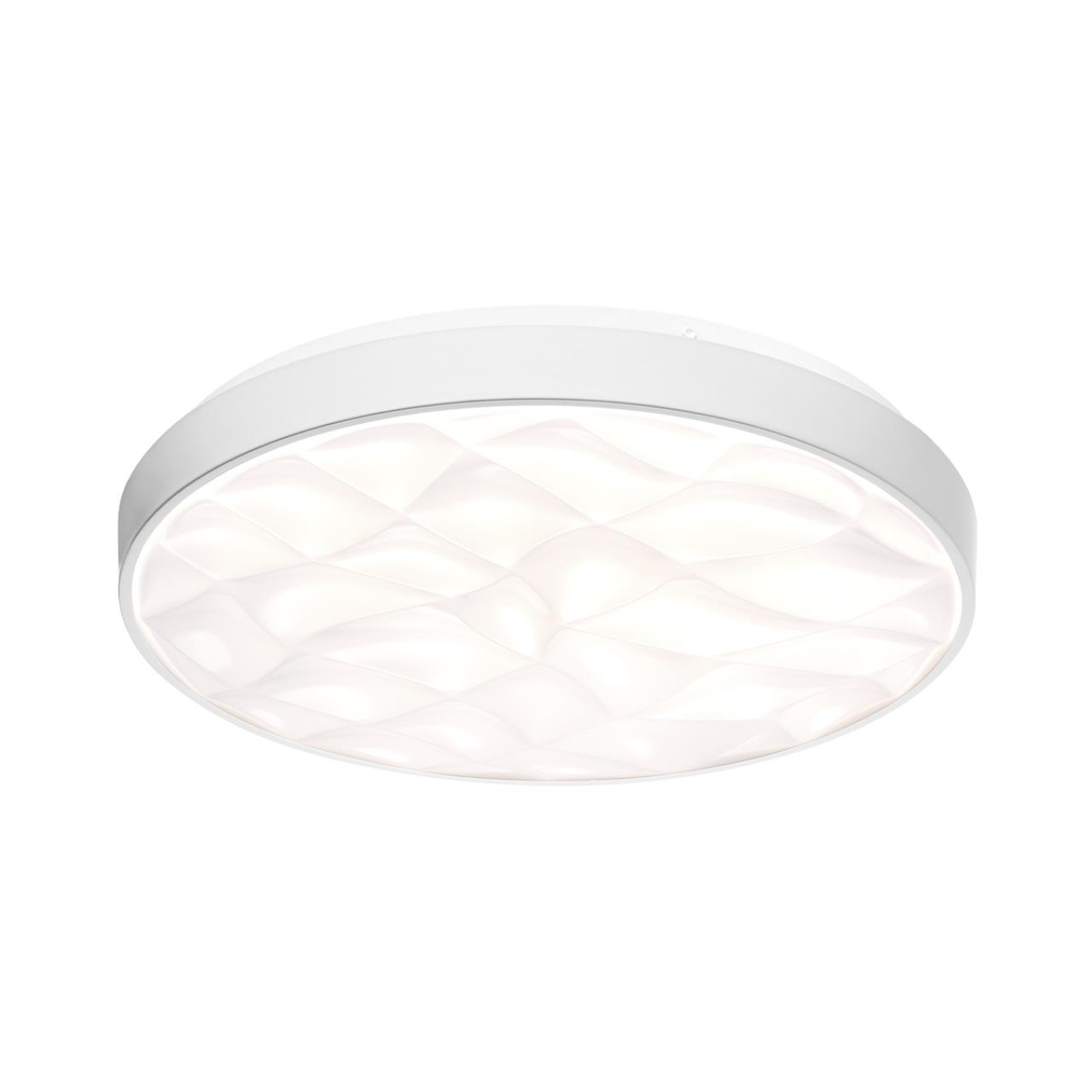 Светильник 7672/ELN линии GITUM состоит из металлического основания (базы) и пластикового рассеивателя. Материал рассеивателя - высококачественный пластик марки PMMA 2.0 белого цвета с матовой поверхностью. Пластик обеспечивает светильнику равномерное рассеивание и хорошее светопропускание. Форма плафона: круглая, декорирована рельефной структурой и ободом из пластика белого цвета. Степень защиты IP43 позволяет использовать светильник в определенных зонах влажных помещений. В комплект входит LED модуль с линзами, мощностью 76Вт, которая соответствует лампе накаливания 740Вт. А также переключатель температуры цвета (ССT) на драйвере, с помощью которого осуществляется изменение цветовой температуры 3000/4000/6000К и переход светильника в режим теплого/белого/холодного света. Для установки необходимого режима рекомендуется использовать удлиненный тонкий предмет типа небольшой отвертки.