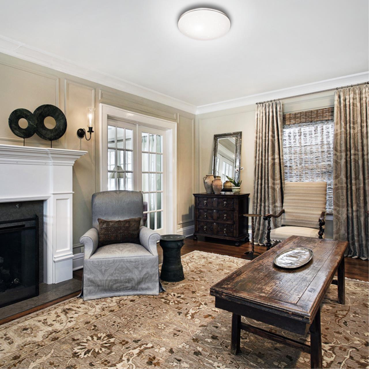 Светильник 2051/DLN линии LEKA состоит из металлического основания (базы) и пластикового рассеивателя. Материал рассеивателя - высококачественный акрил белого цвета с глянцевой поверхностью, обеспечивающий светильнику равномерное рассеивание и хорошее светопропускание. Форма плафона: круглая, декорирована ободом цвета хром и прозрачными точками, придающими включенному светильнику красивый эффект "звездного мерцания" и переливания. Степень защиты IP43 позволяет использовать светильник в определенных зонах влажных помещений. В комплект входит LED модуль с линзами, мощностью 48Вт, которая соответствует лампе накаливания 515Вт. А также переключатель температуры цвета (ССT) на драйвере, с помощью которого осуществляется изменение цветовой температуры 3000/4000/6000К и переход светильника в режим теплого/белого/холодного света. Для установки необходимого режима рекомендуется использовать удлиненный тонкий предмет типа небольшой отвертки.