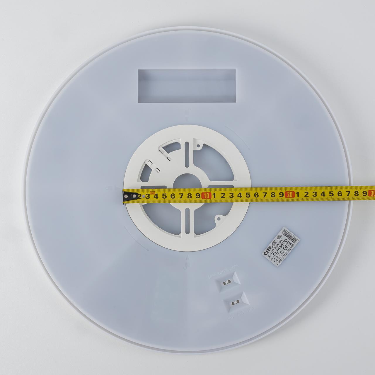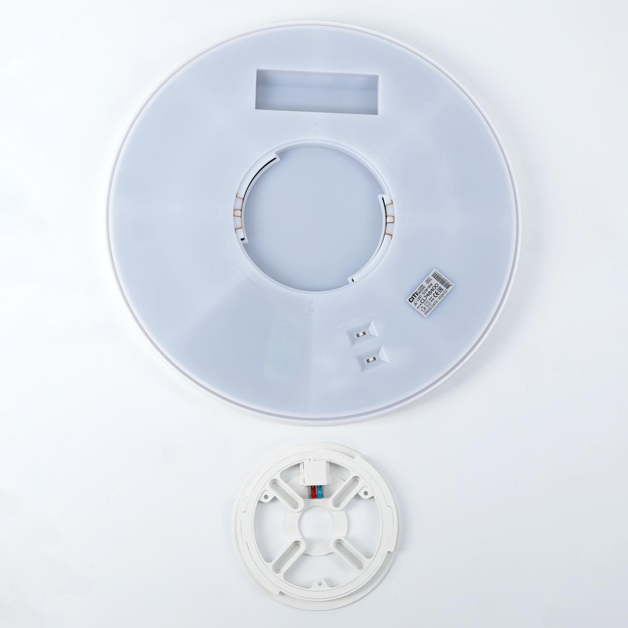 Изделие обладает высокой энергоэффективностью основного света – 120Лм/Вт, осветит до 16м². Мощность: основной свет - 32Вт, потолочная подсветка - 8Вт. Диаметр 40см, высота 2,5см. Свет безопасный для глаз, без мерцания и пульсаций. Тип крепления – удобная монтажная платформа.