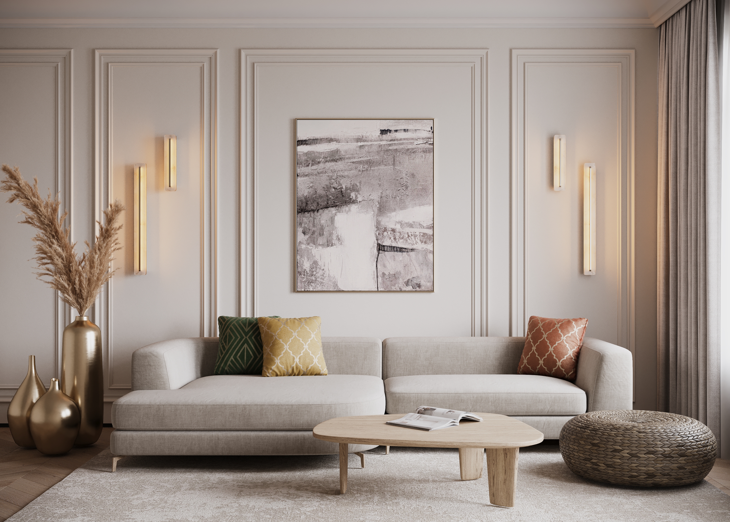 Настенные светильники с рассеивателем из алебастра. Цвет арматуры — латунь. Материал арматуры — металл. LED-источник света. Цветовая температура 3000К. Три размера: 400, 600, 800 мм. Возможность создания композиций и установки горизонтально или вертикально. Мягкий переотраженный свет. Основание из металла цвета сатинированной латуни. Модульный дизайн для создания световых инсталляций.