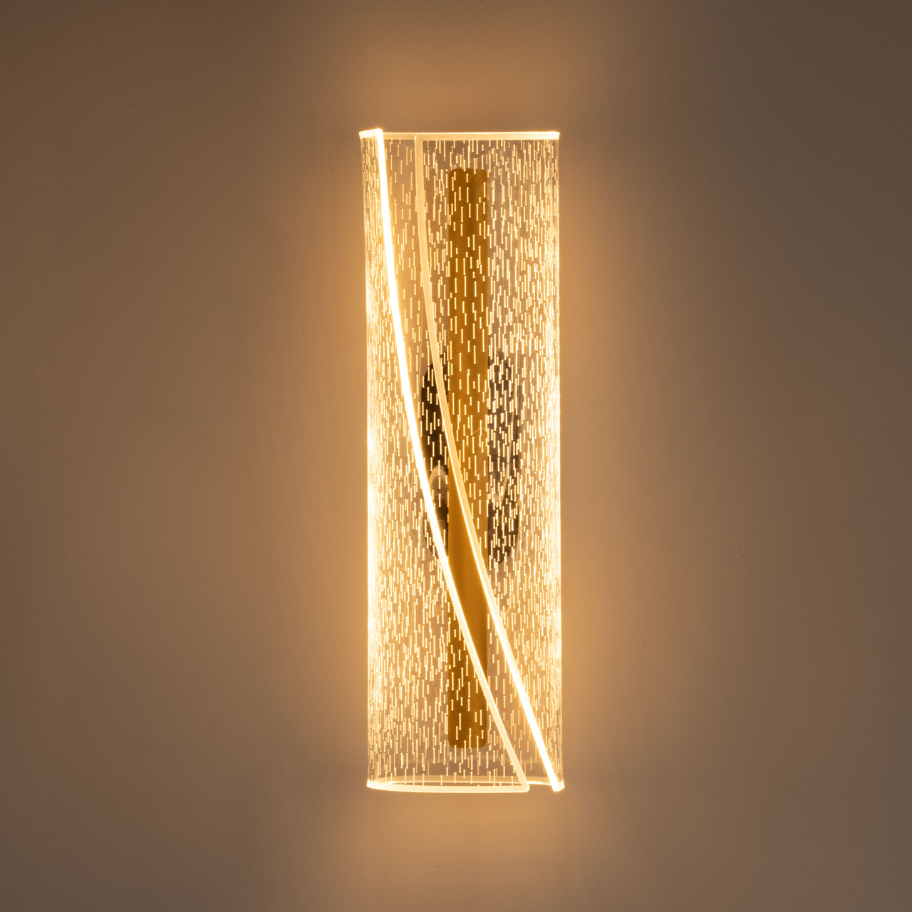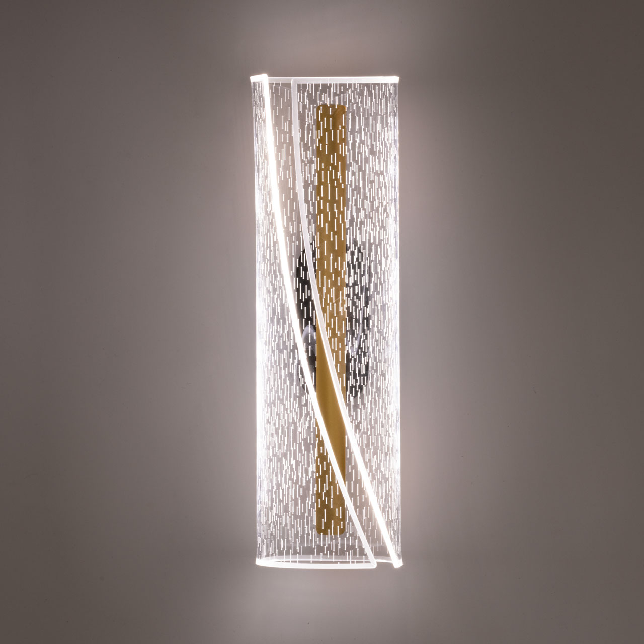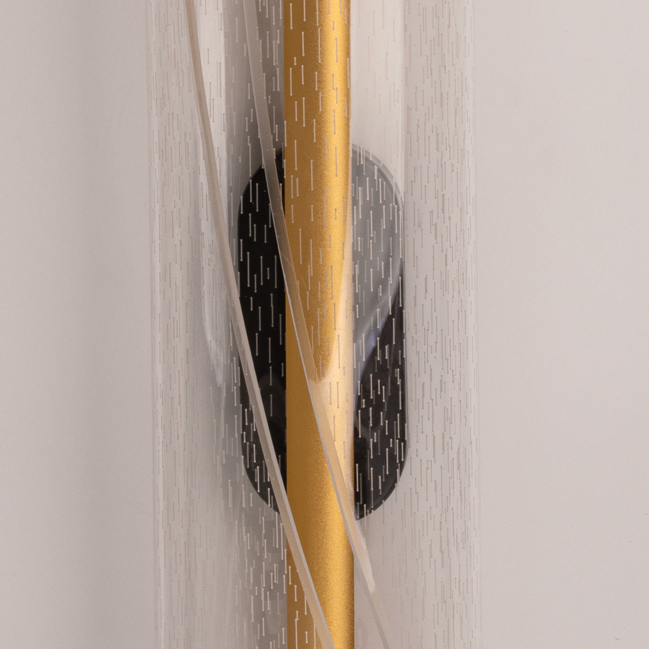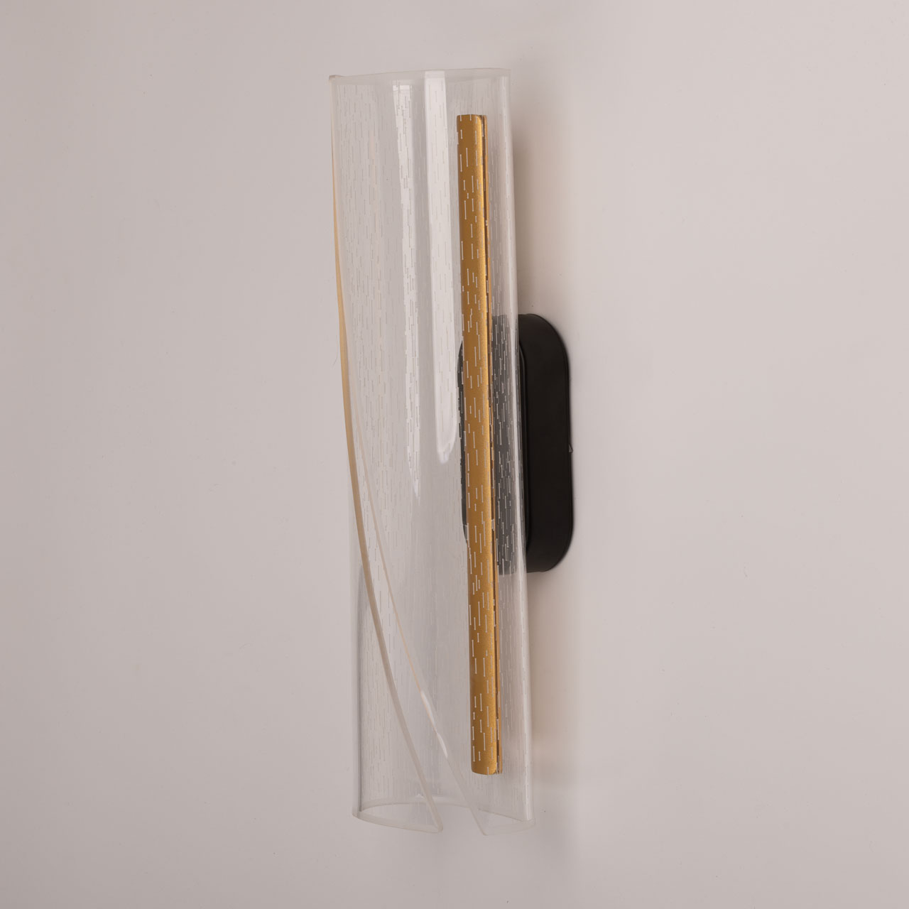 Металлическое основание настенного бра окрашено в черный цвет. Основа плафона выполнена из сплава алюминия с цинком и гальванизирована в цвет золота. Настенное бра декорировано прозрачным акриловым плафоном.