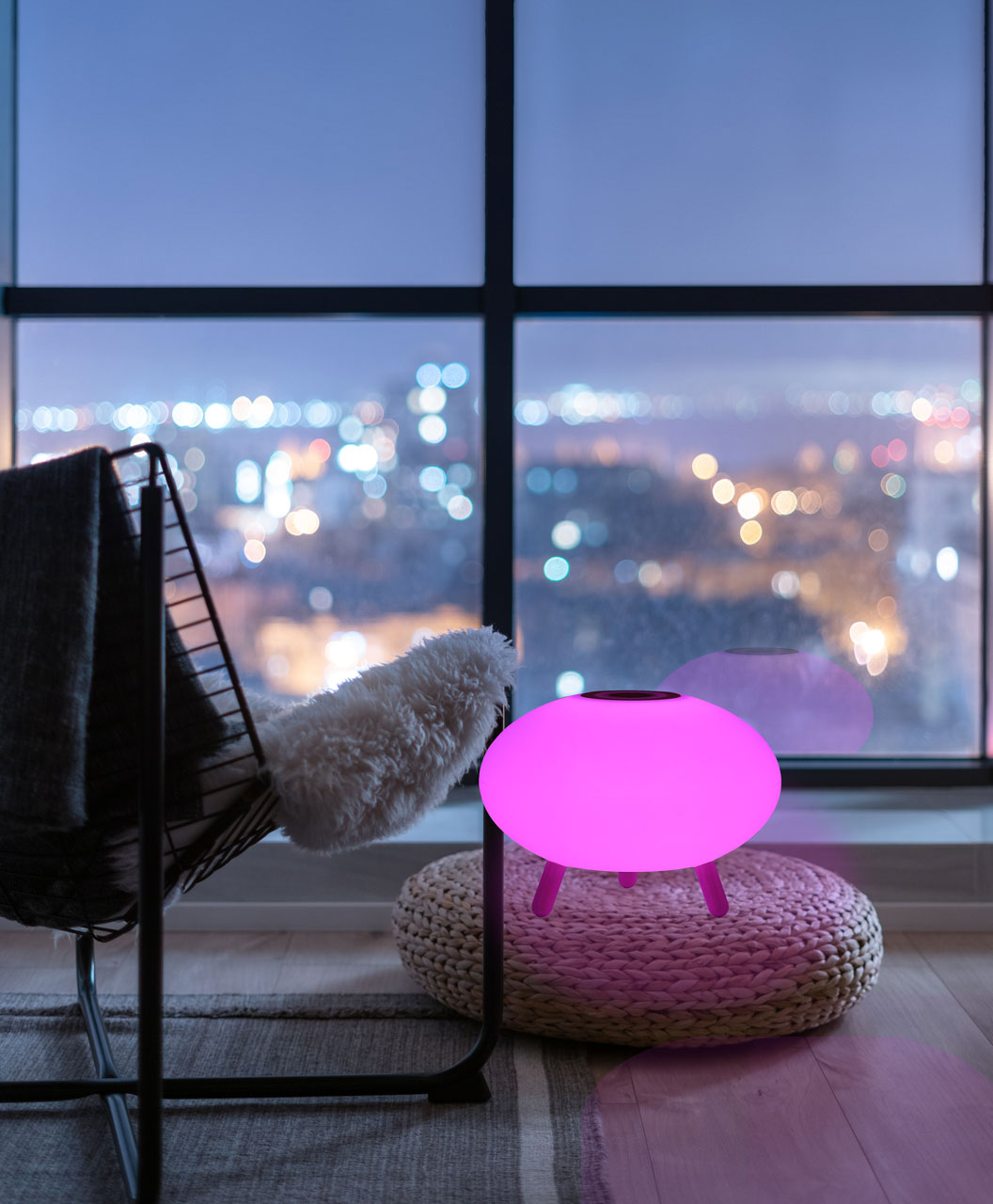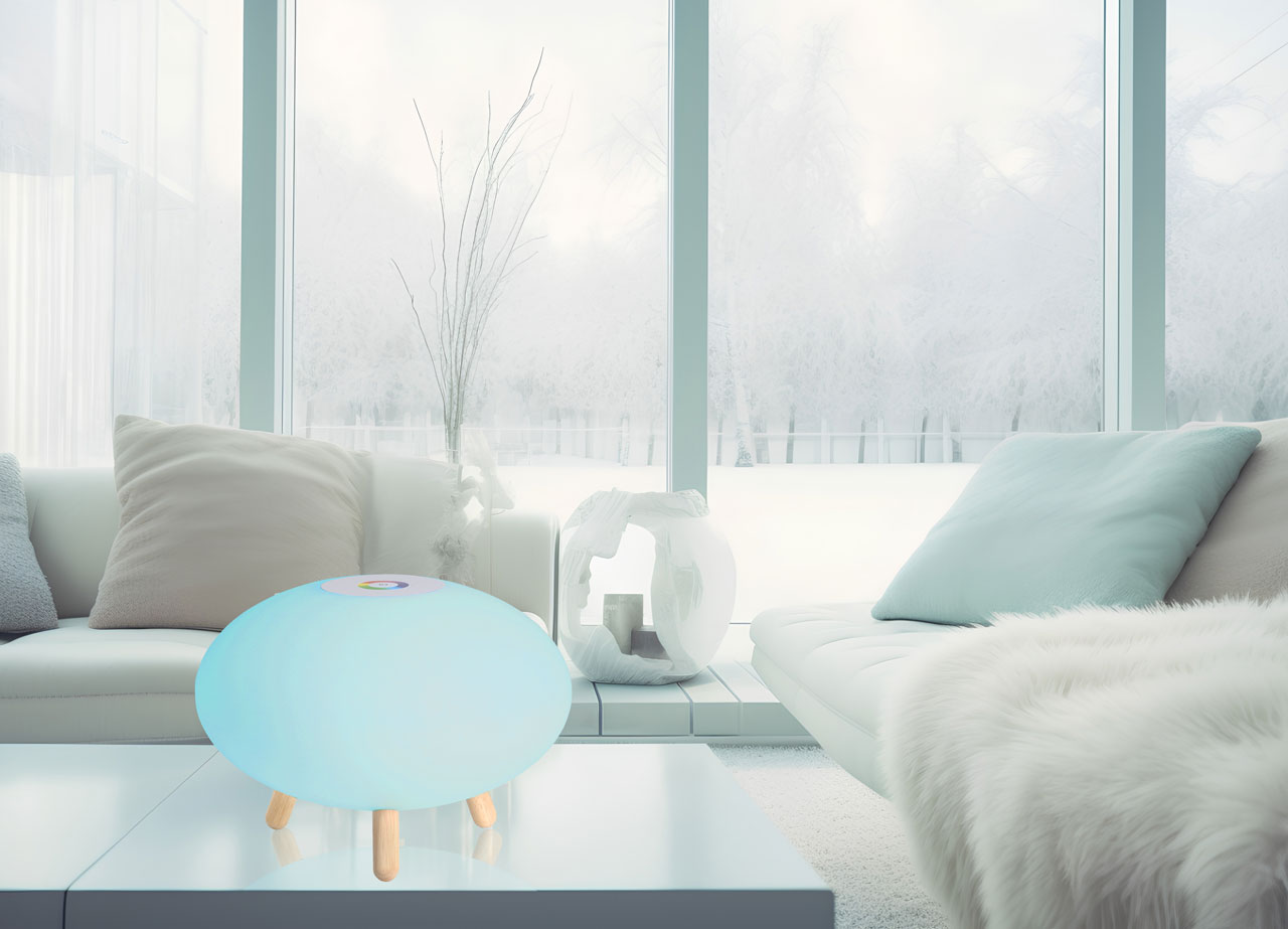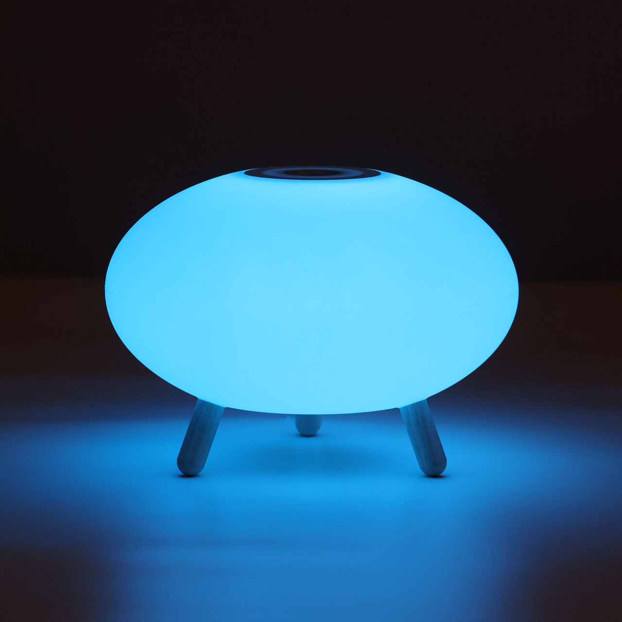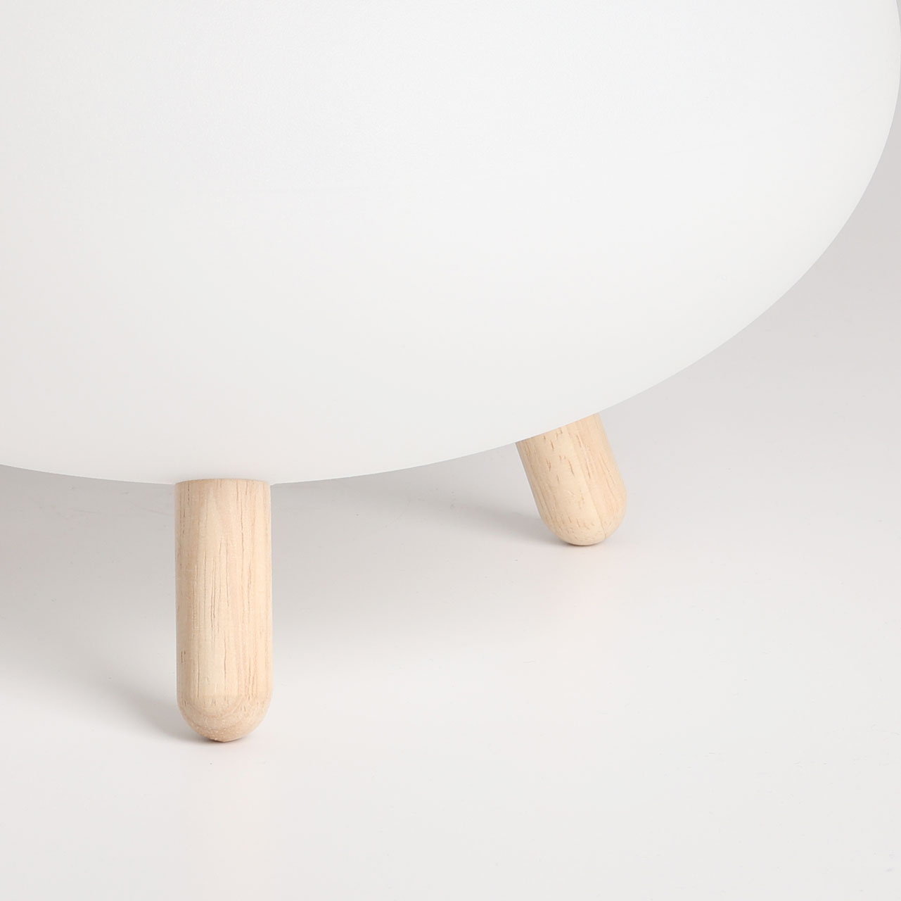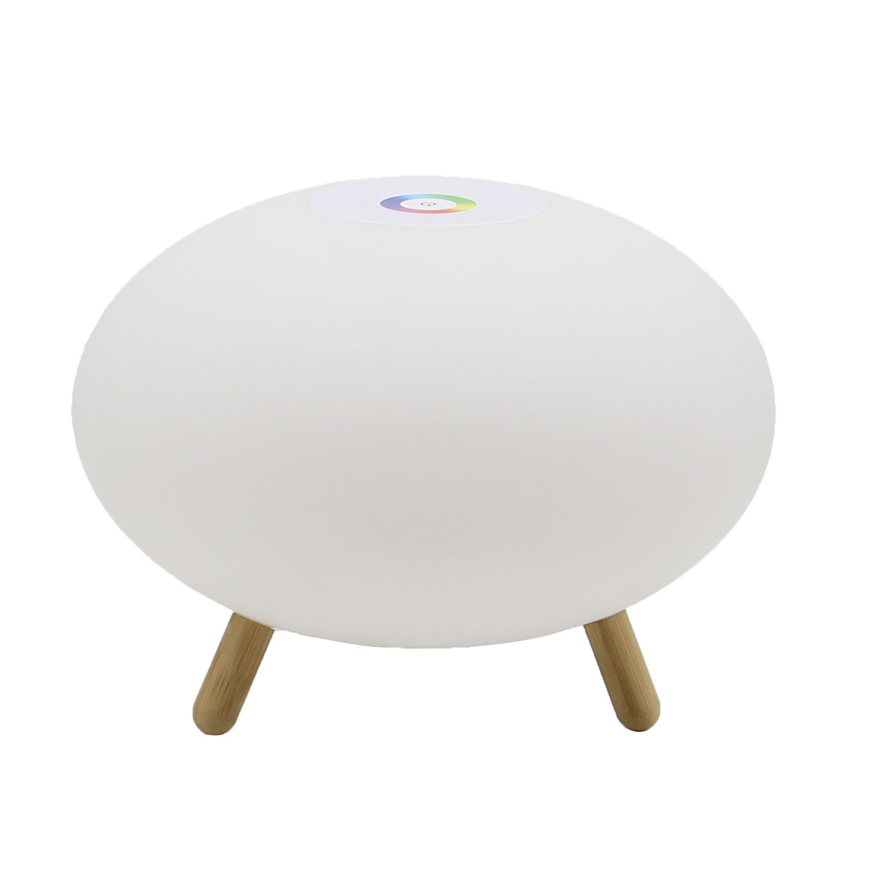 Светодиодный источник света белый, теплый+RGB закрыт белым матовым акрилом.Настольная лампа устанавливается на деревянные ножки цвета светлого дерева.Управление светильником расположены на корпусе плафона. Зарядный кабель USB входит в комплект.