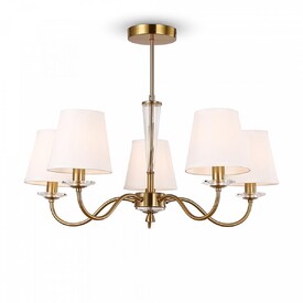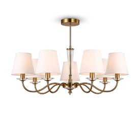 Цвет и материалы, использованные в изготовлении лампы, также важны. Общий цвет лампы - белый, включая цвет плафонов и отделку арматуры в латунном цвете. Материалы включают текстильные плафоны и металлическую арматуру.