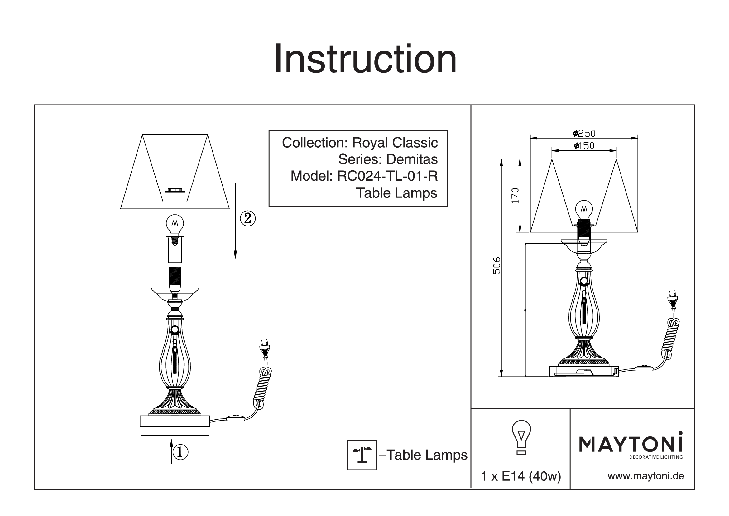Настольная лампа Maytoni Demitas RC024-TL-01-R от немецкого бренда представляет собой элегантное и стильное решение для вашего интерьера. Этот изысканный предмет декора добавит нотку роскоши и изысканности в ваше интерьерное пространство. Лампа имеет компактные размеры 506 мм х 250 мм, что позволяет установить ее на любом удобном месте, обеспечивая достаточное освещение для вашего рабочего стола или столовой. Технические характеристики лампы также впечатляют. Осветительный прибор оснащен одной лампой с типом цоколя Е14 и мощностью 40 Вт, что гарантирует легкую замену и установку осветительных элементов и позволяет равномерно осветить площадь в 2 квадратных метра. Лампа выполнена в бело-бежевых тонах, что придает ей шикарный и изысканный вид. Бежевый цвет тканевого абажура из органзы и бронзовый цвет арматуры из металла гармонично сочетаются между собой, создавая элегантный контраст. Основание настольного светильника декорировано завитками из металла, а ножка гофрированным белым элементом, напоминающим собранный занавес. В качестве декоративных элементов используется подвес с жемчугом, стразами и цепочками, а также античная фреска, нанесенная на чашу под абажуром. Технической особенностью является наличие выключателя на кабеле. Производитель дает гарантию на свое изделие 2 года. Настольная лампа Maytoni Demitas RC024-TL-01-R — это прекрасное сочетание стиля, функциональности и качества. Торопитесь сделать заказ в интернет-магазине 220svet.ru!
