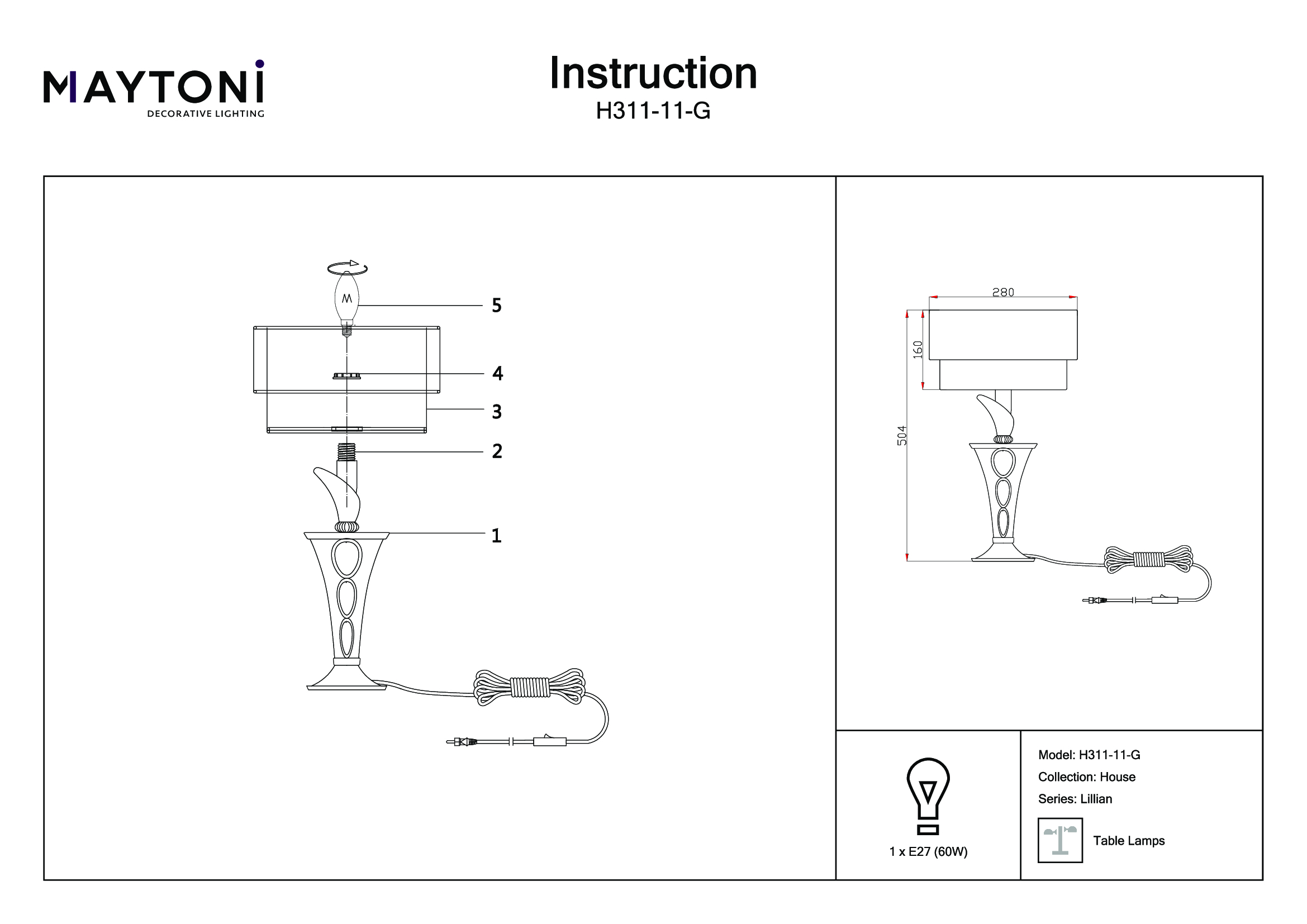 - Мощность лампы: 60 W
