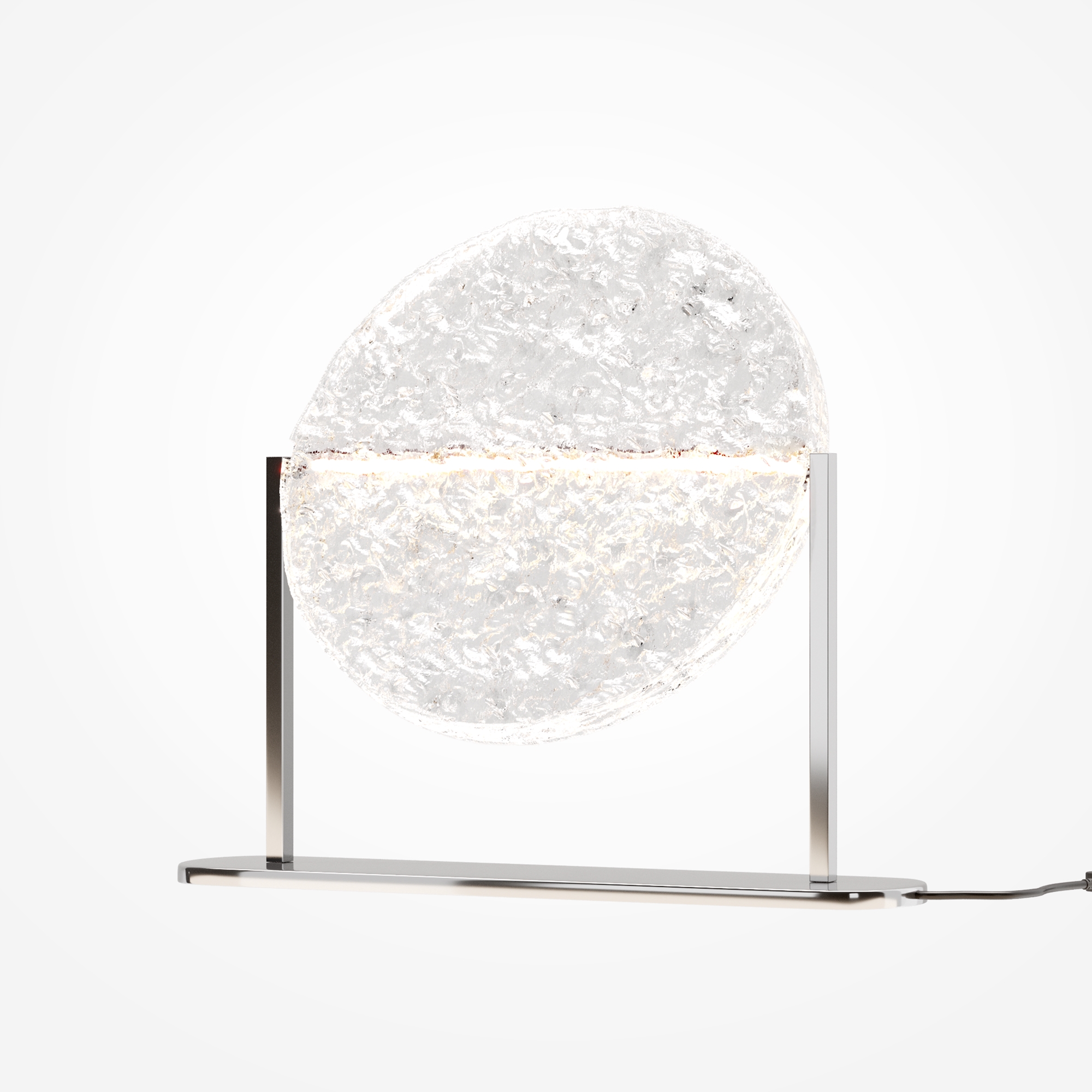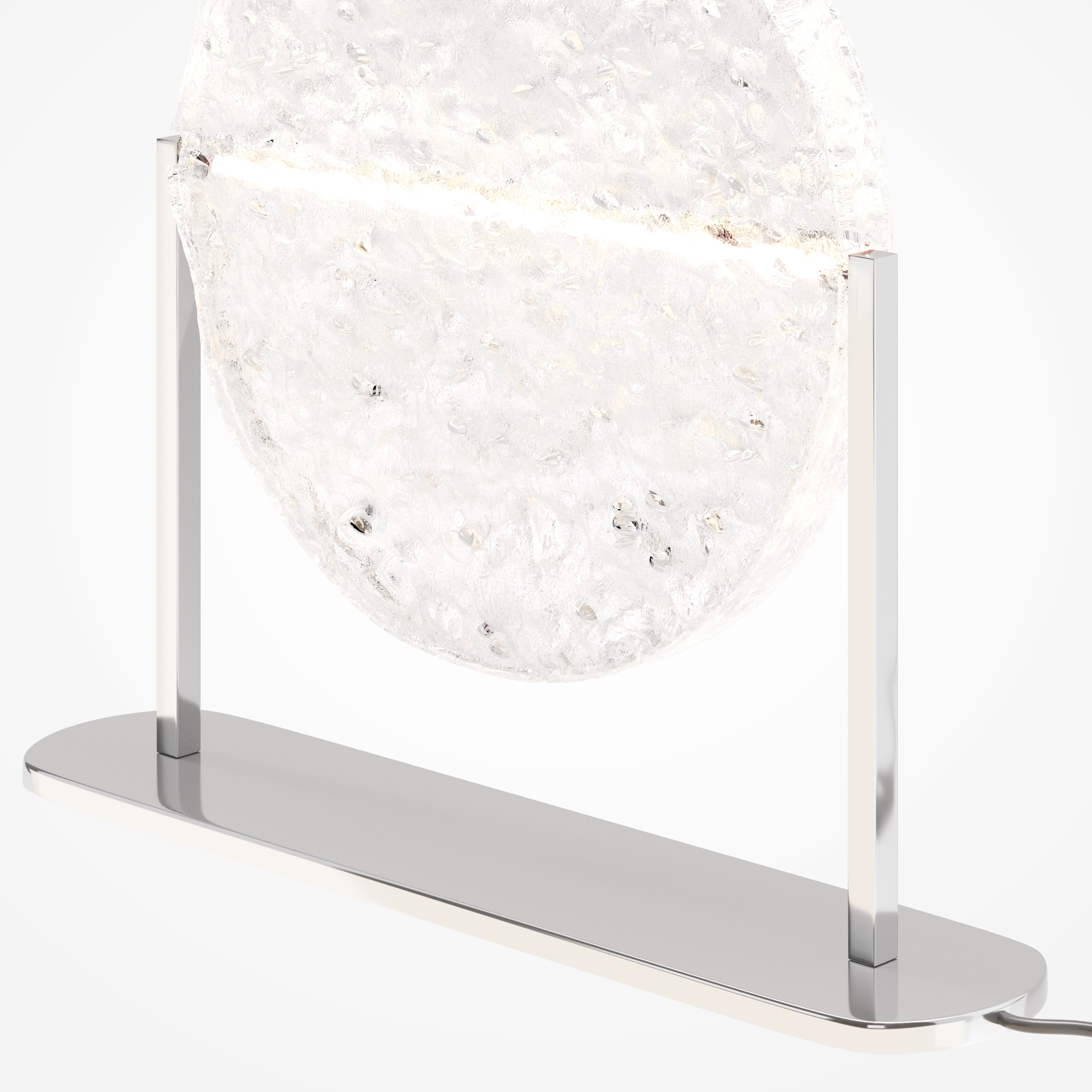 Материал арматуры - металл. Хромированное основание. Поворотный стеклянный рассеиватель, имитирующий лунное отражение на воде. LED-источник света. Настольная лампа и бра в коллекции. Возможность моделирования световых сценариев. Текстурное стекло для мягкого и широкого свечения. Дизайнерская серия, созданная в сотрудничестве с Британской Высшей школой Дизайна.