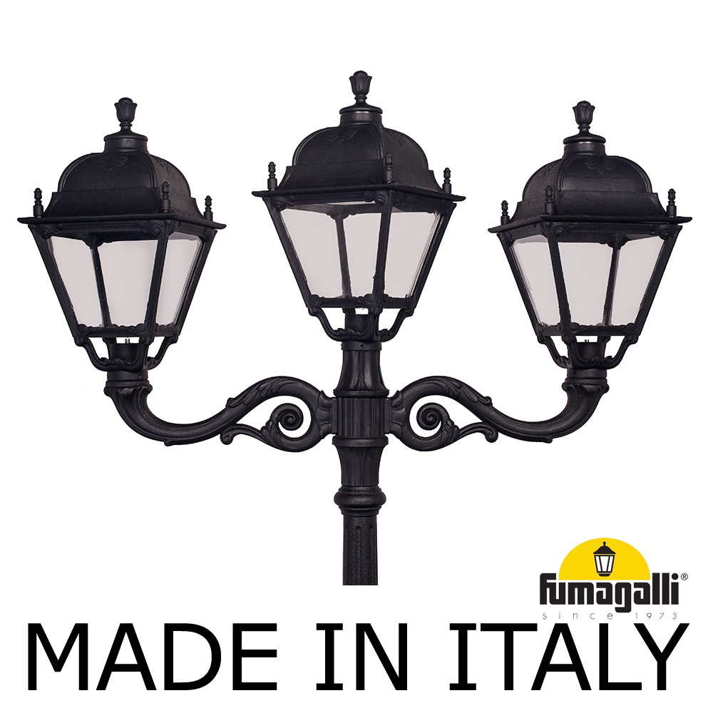 Парковый фонарь FUMAGALLI большого размера серии SIMON, модель HOREB ADAM/SIMON 2L+1. Парковый фонарь с 2 светильниками большого размера, на консолях ADAM большого размера, плюс 1 венчающий светильник, установленные на классическом столбе HOREB высотой 3,5 м (+высота фонарей на кронштейнах). Изготовлены в Италии, по уникальным технологиям "FUMATECH" из современного композитного полимера RESIN. Этот материал в 5 раз прочнее металла, не ржавеет, не окисляется, не выгорает на солнце, его не нужно красить. Все светильники пыле-влаго защищены по стандарту IP55 (Пылезащищенные, защита от водяных струй с любого направления). Рассеиватель выполнен из антивандального, не мутнеющего и не горючего PMMA (ПолиМетилМетаАкрилат). Срок службы светильника - не менее 20 лет. Температура использования от -60 до +90. В серии SIMON есть садовые фонари в настенном (OFIR/SIMON, MIRRA/SIMON) подвесном (SICHEM/SIMON) и наземном исполнении (IAFAET.R/SIMON, ALOE.R/SIMON, ARTU/SIMON, GIGI/SIMON, RICU/SIMON, NEBO/OFIR/SIMON 1L, NEBO/OFIR/SIMON 2L, TABOR/ADAM/SIMON 3L) со столбами разной высоты, с разным количеством и конфигурацией голов. Консоли настенных фонарей и кронштейны светильников на столбах освещения могут устанавливаться в положение вверх и вниз. Столбы выше 150 см имеют в основе мощную стальную трубу с двойной оцинковкой. При заказе требуется выбрать цвет корпуса, цвет плафона и тип патрона (Е-27 или LED GX-53). Возможен светодиодный вариант. По стилю и дизайну серия уличных светильников SIMON похожа на светильники среднего размера серии CEFA. По размеру относится к большим парковым светильникам как серия NOEMI и GLOBE 400.