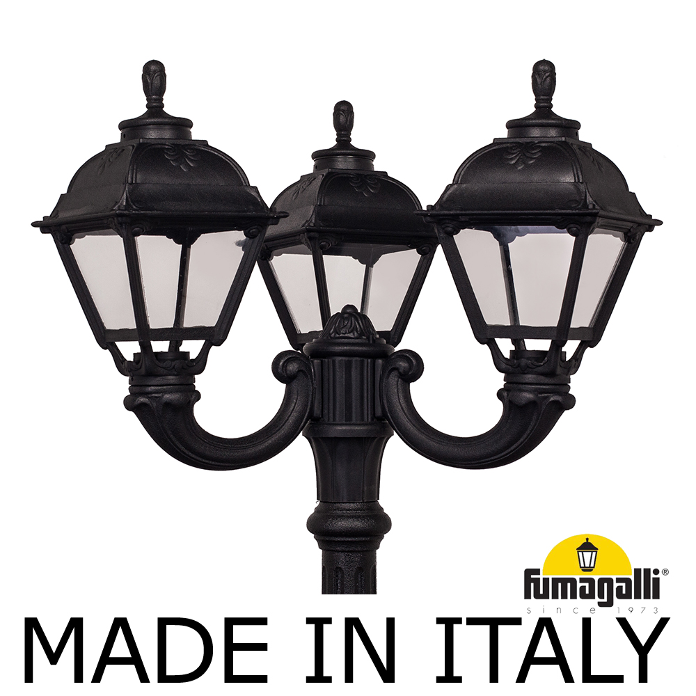 Парковый фонарь FUMAGALLI среднего размера серии CEFA, модель TABOR OFIR/CEFA 3L. Парковый фонарь с 3 светильниками, на консолях OFIR среднего размера, установленных на классическом столбе TABOR высотой 3,0 м (+высота фонарей на кронштейнах). Изготовлены в Италии, по уникальным технологиям "FUMATECH" из современного композитного полимера RESIN. Этот материал в 5 раз прочнее металла, не ржавеет, не окисляется, не выгорает на солнце, его не нужно красить. Все светильники пыле-влаго защищены по стандарту IP55 (Пылезащищенные, защита от водяных струй с любого направления). Рассеиватель выполнен из антивандального, не мутнеющего и не горючего PMMA (ПолиМетилМетаАкрилат). Срок службы светильника - не менее 20 лет. Температура использования от -60 до +90. В серии CEFA есть садовые фонари в настенном (OFIR/CEFA, MIRRA/CEFA) подвесном (SICHEM/CEFA) и наземном исполнении (IAFAET.R/CEFA, ALOE.R/CEFA, ARTU/CEFA, GIGI/CEFA, RICU/CEFA, NEBO/OFIR/CEFA 1L, NEBO/OFIR/ANNA 2L, TABOR/ADAM/CEFA 3L) со столбами разной высоты, с разным количеством и конфигурацией голов. Консоли настенных фонарей и кронштейны светильников на столбах освещения могут устанавливаться в положение вверх и вниз. Столбы выше 150 см имеют в основе мощную стальную трубу с двойной оцинковкой. При заказе требуется выбрать цвет корпуса, цвет плафона и тип патрона (Е-27 или LED GX-53). Возможен светодиодный вариант. По стилю и дизайну серия уличных светильников CEFA похожа на светильники большого размера серии SIMON . По размеру относится к средним парковым светильникам как серия RUT и GLOBE 300.