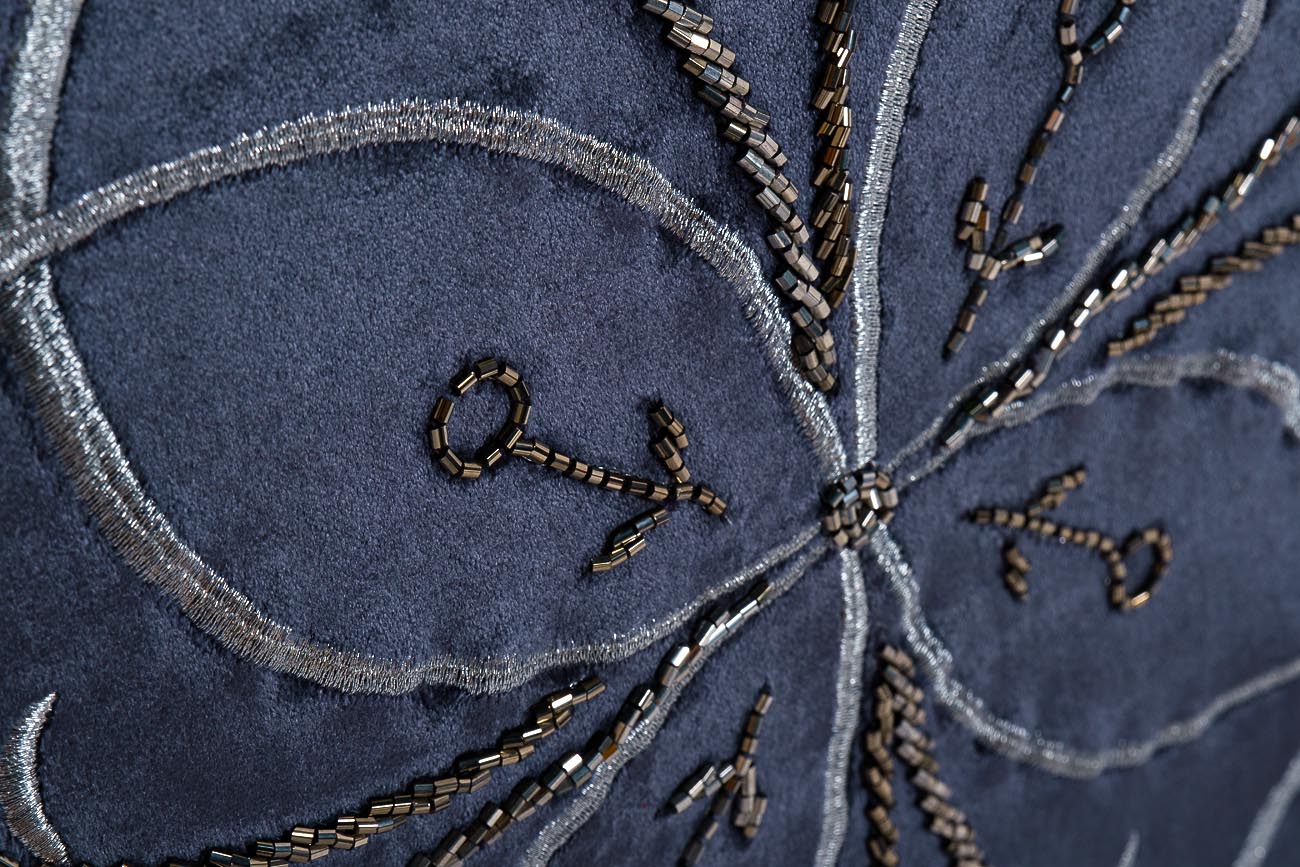 Обратите внимание на декоративную подушку с вышивкой в насыщенном синем цвете, обрамленную оригинальным узором из бисера и серебристых нитей. Бисер – материал для декора вне времени, актуальный для ценителей роскоши и вещей, декорированных вручную. Эта декоративная подушка с узором станет достойным украшением интерьера любого стилевого направления – от классического до современного. Сочетайте изделие с мягкой мебелью синего цвета других оттенков и вы получите роскошный интерьерный комплект, воплощающий умиротворение, богатство, и изысканность.