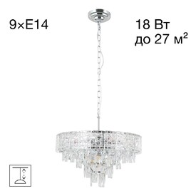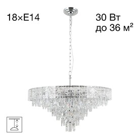 В изделии используются 11 ламп с цоколем Е14 максимальной мощностью для ламп накаливания 60Вт. Светильник оснащён дополнительной светодиодной подсветкой мощностью 24Вт (цветовая температура 3000К). Площадь освещения от 15 до 30м². Модель подходит для работы как с одноклавишным, так и с двухклавишным выключателем.