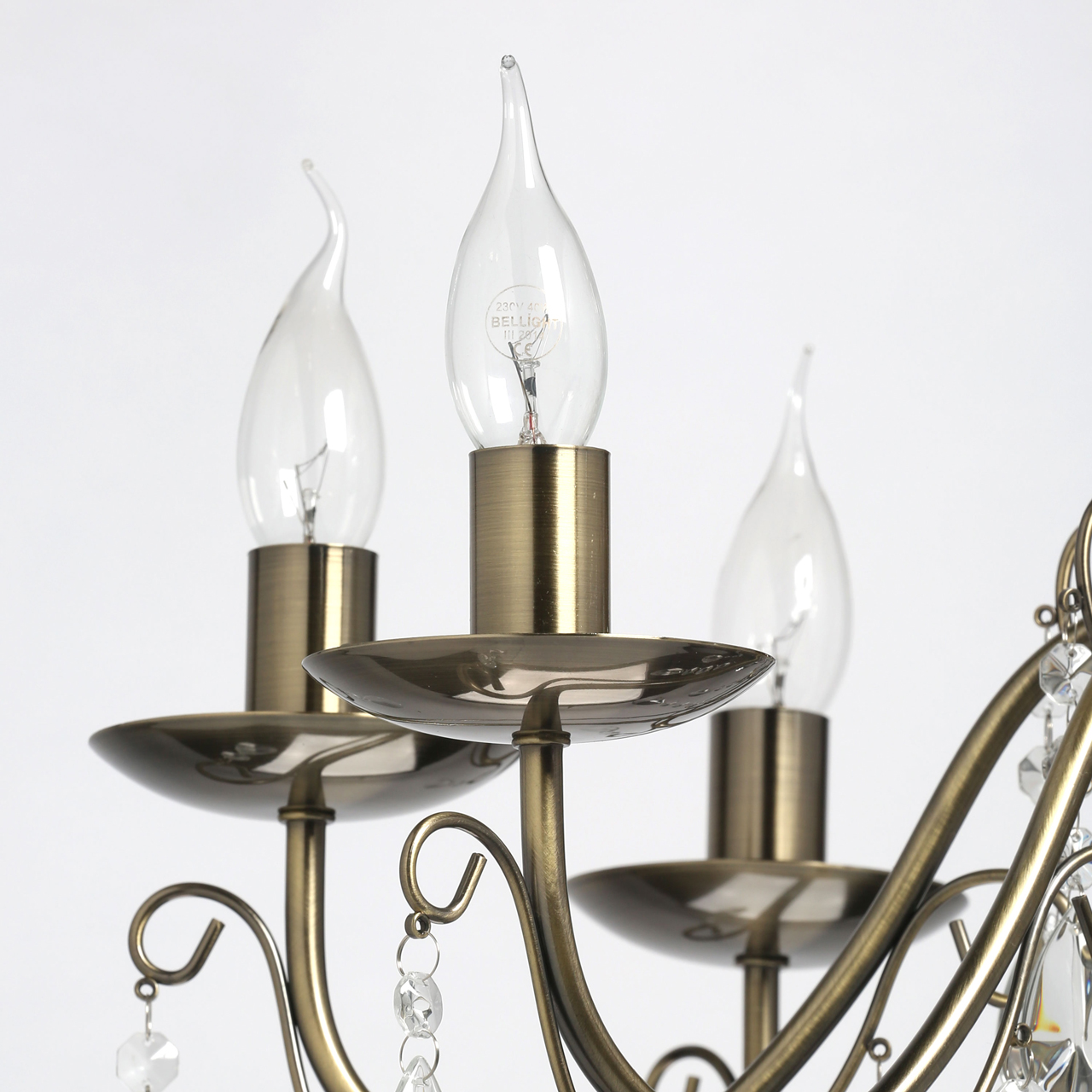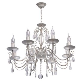 Отсутствие закрытых плафонов обеспечивает высокий уровень освещенности: потолочная лампа может быть использована в комнате площадью до 24 кв. м. Несмотря на внушительные размеры, она весит всего 2.8 кг. Оригинальный дизайн дополнят восемь ламп с цоколем E14 в форме «свеча» или «свеча на ветру», устанавливаемых по всему периметру светильника. Его высота регулируется за счет звеньев цепи.