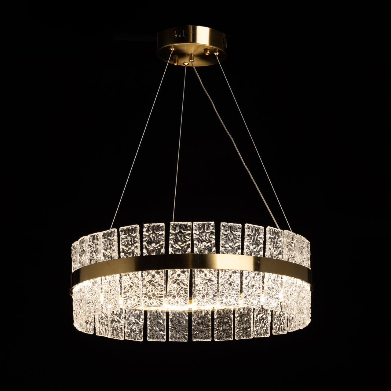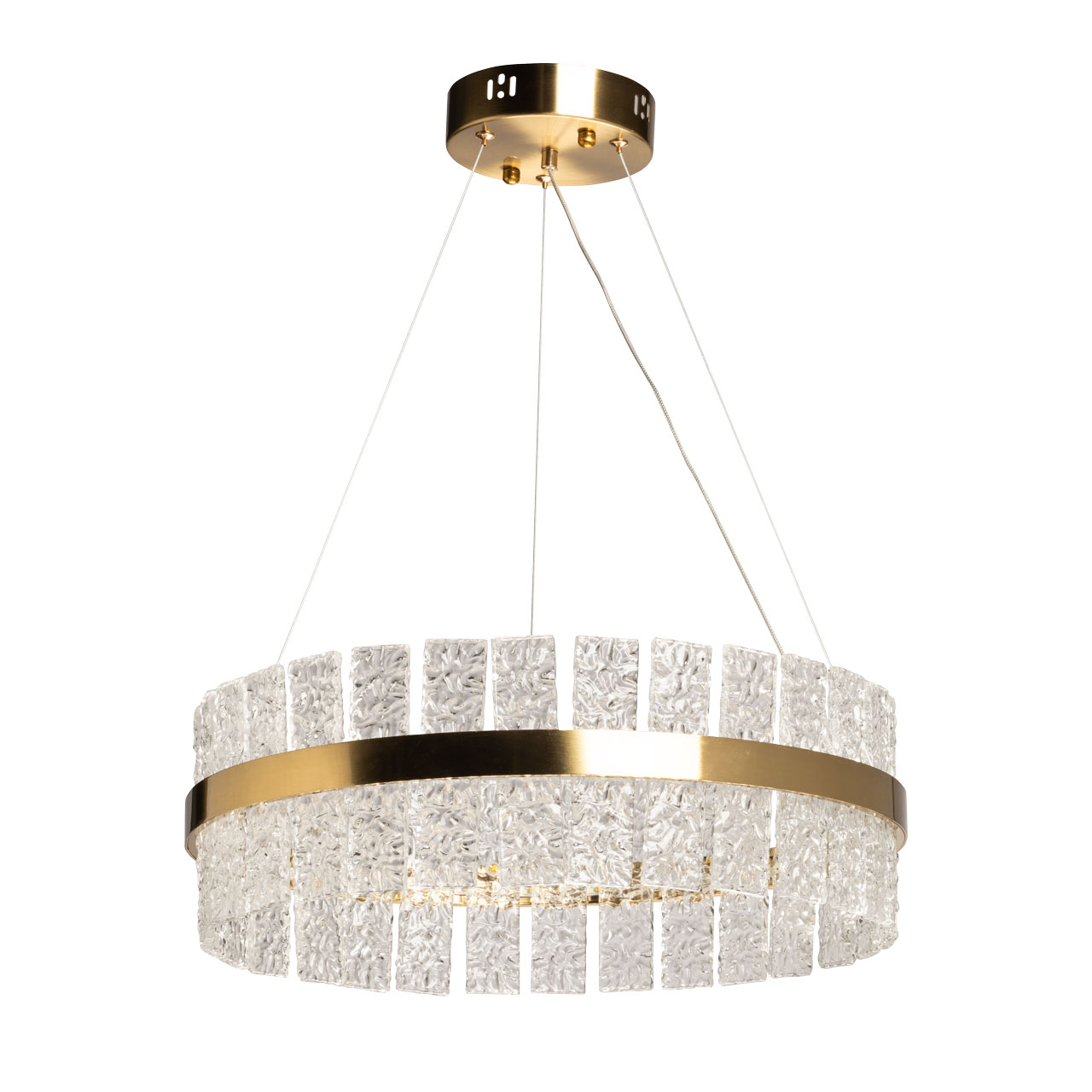 Металлическое основание подвесной люстры гальванизировано в цвет золота. Люстра декорирована прозрачными пластинами из фактурного стекла.