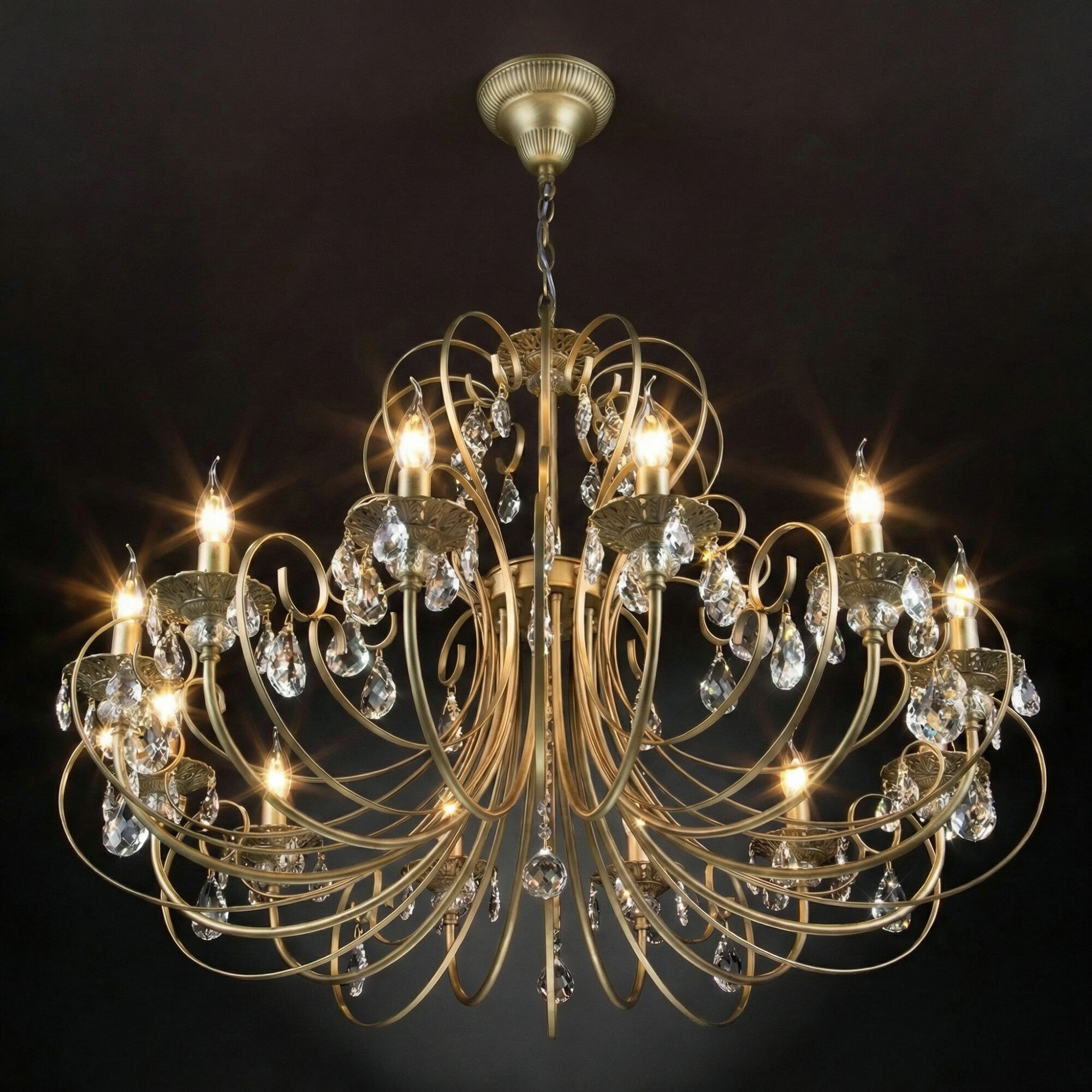 Светильник, вдохновлённый дворцовыми интерьерами: латунная арматура с утончёнными вензелями хранит память о вековых традициях мастерства, а бесцветный хрусталь преломляет свет, создавая эффект сияющих звёзд.