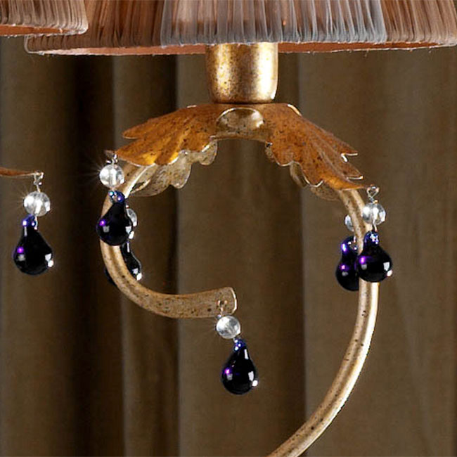Подвесной светильник VOLGA выполнен из металла с покрытием "состаренное золото". Оснащен пятью световыми элементами под двухцветными плиссированными абажурами. Декорирован подвесками из прозрачного стекла и стекла аметистового цвета.