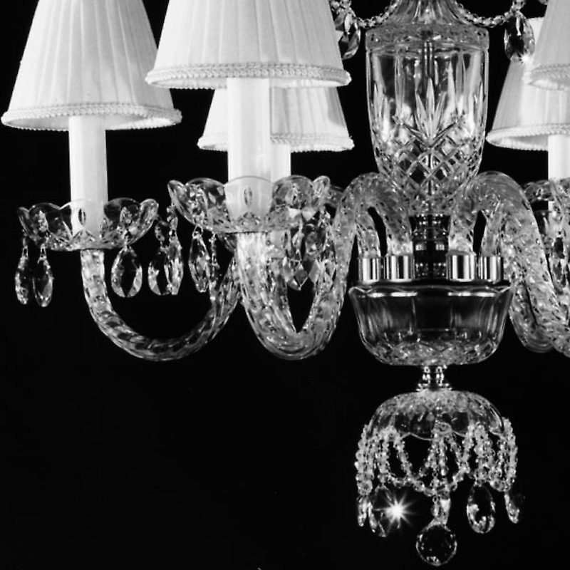 Люстра 6-ти рожковая на хромированной арматуре с хрустальной вазой и чашечками. Текстильные плиссированные абажуры белого цвета. Декор: хрустальные подвески и кристаллы Swarovski Spectra на арматуре. Высота светильника регулируется за счет звеньев цепи.