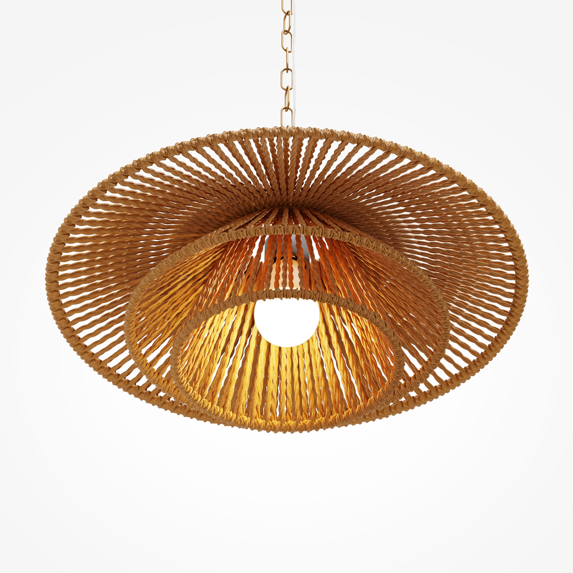 Материал абажура — натуральный ротанг. Металлическая арматура в цвете латуни. Две формы абажуров. Металлическая цепь в цвете латунь длиной 3 метра, подходит для помещений с высокими потолками. Эко-дизайн, вдохновленный дикими пляжами Индийского океана. Сменный источник света.