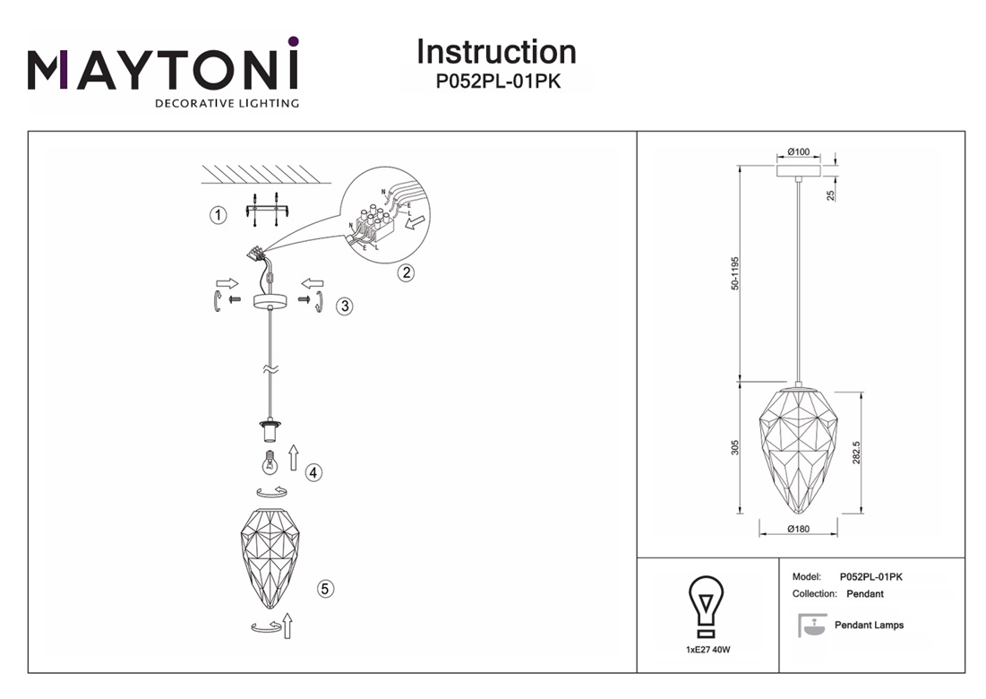 Подвесной светильник Maytoni Globo P052PL-01PK — это надёжный и долговечный осветительный прибор, который станет прекрасным дополнением вашего дома и будет радовать вас своим стильным дизайном и функциональностью на протяжении многих лет.