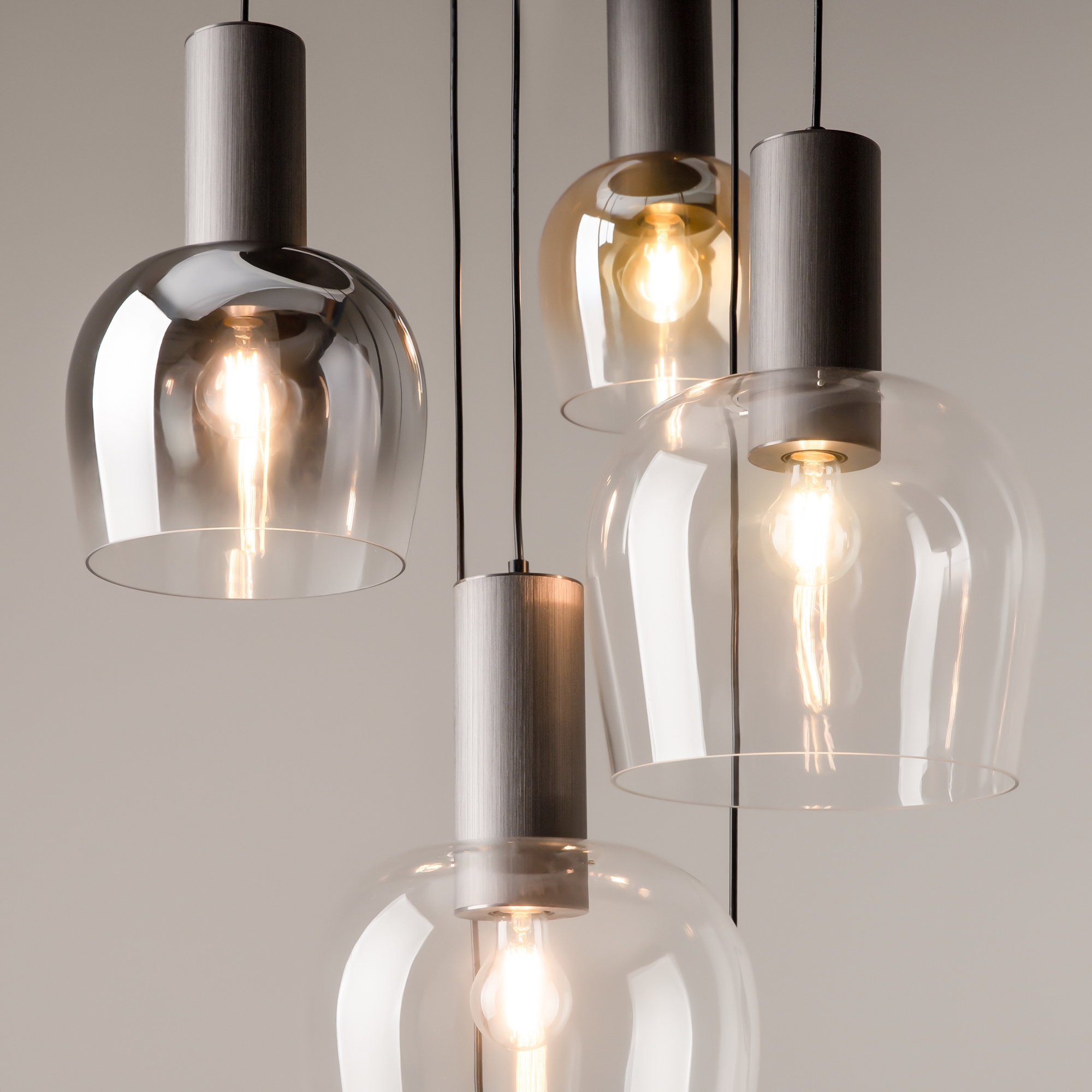 Цветовая гамма: дымчато-серый или насыщенно-янтарный цвет стекла в сочетании с черной или золотой арматурой. В серии есть модели светильников со сменным источником света с цоколем Е27 (каскадная композиция, потолочный и настольные светильники) и LED-источником (одинарные подвесные светильники). Температура свечения LED – 3000 К, угол рассеивания — 120 градусов. Плафоны каскадной композиции плафоны разных размеров и оттенков, установленные на одно основание. Оригинальный декор — актуальный вариант современной классики.