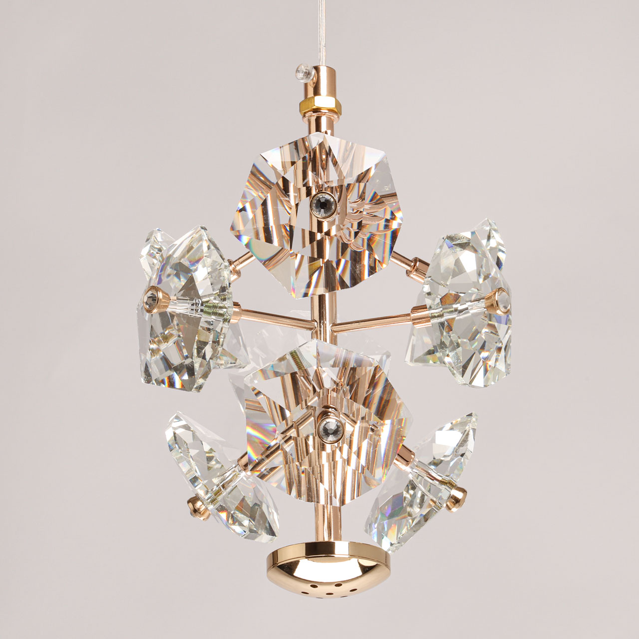 Металлическое основание подвеса гальванизировано в цвет золота. Подвес декорирован прозрачными хрустальными элементами.