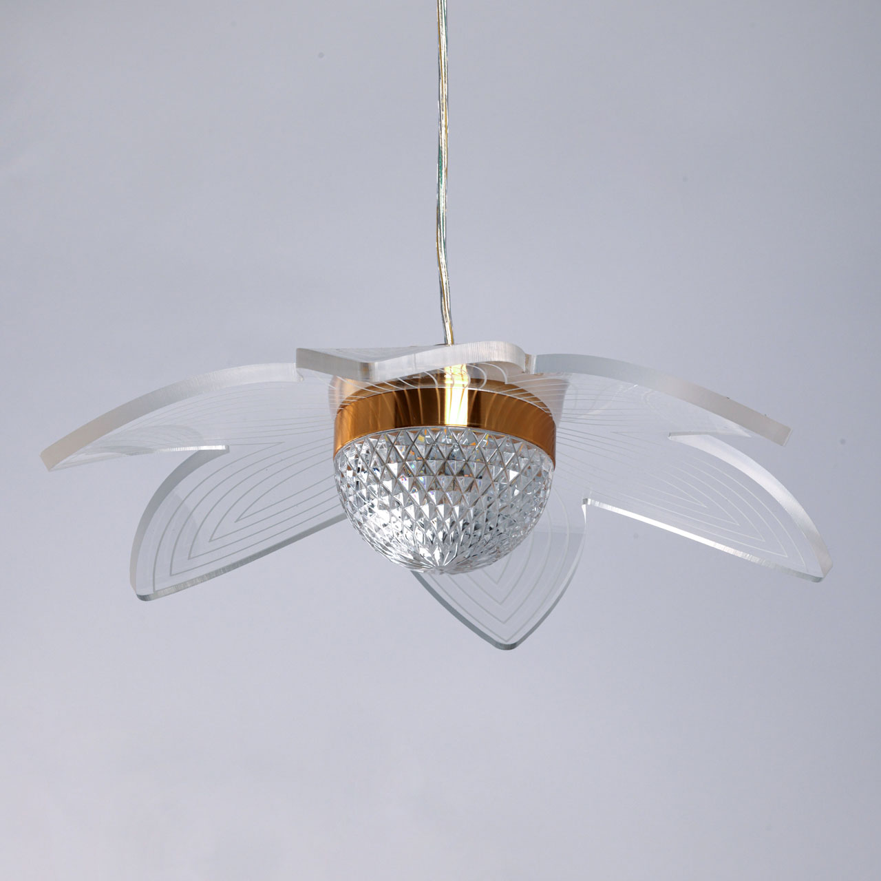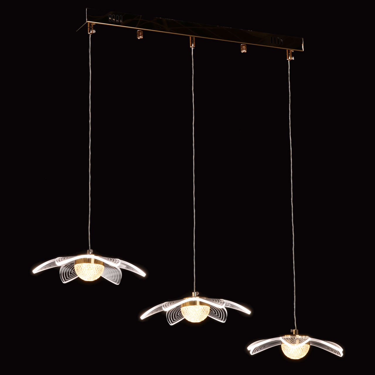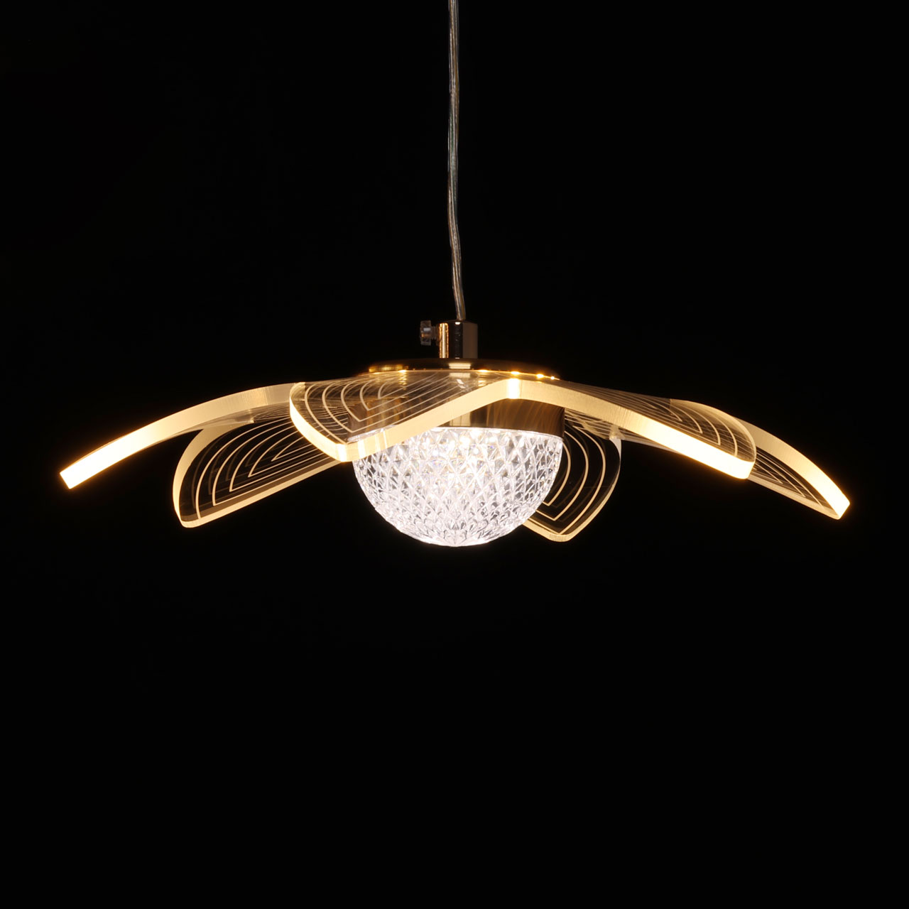 Цвет золота прекрасно сочетается с современными формами и материалами. Светодиодные источники света закрыты прозрачным многогранным акрилом, создающим эффект красивой игры бликов света. Эстетическую привлекательность придают светильнику внешние плафоны в виде цветов. Многорежимность освещения от 3000К до 6500К позволяет подобрать комфортную температуру света. Качественные светодиоды экономичны и долговечны.
