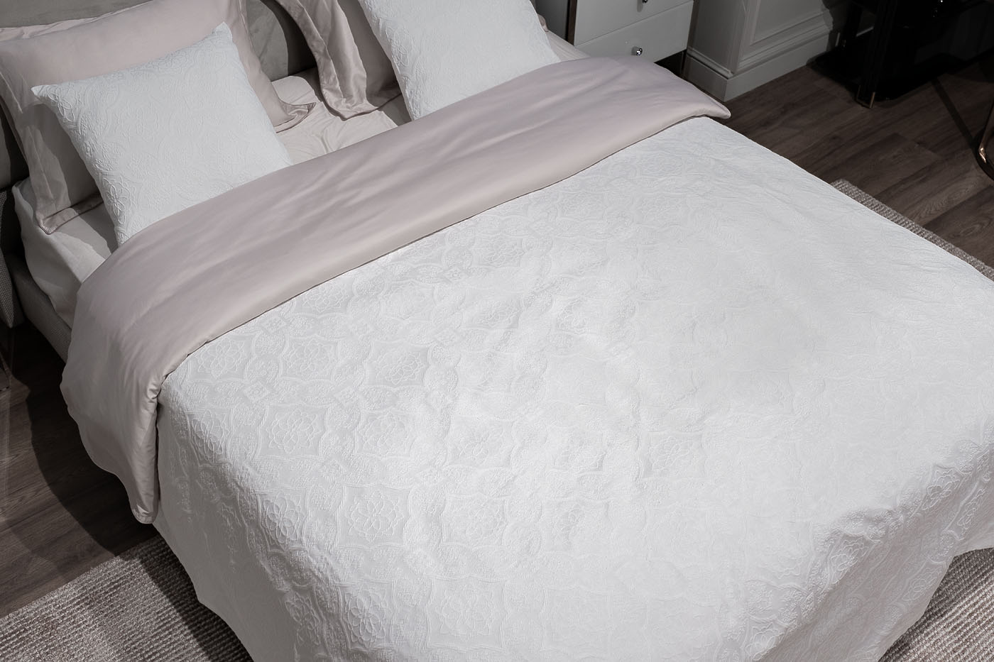 Легкое покрывало «Тиара» изготовлено из экологичного хлопка в сочетании с практичным и долговечным полиэстером. Ткань легко чистится и стирается в домашних условиях, быстро сохнет. Добавление полиэфирного волокна увеличивает срок службы изделия и его устойчивость к выгоранию. Жаккардовый рисунок в классическом стиле будет актуален во все времена, а белый цвет освежит и украсит дизайн вашего дома. Покрывало можно использовать как накидку для дневного отдыха, так и летнее одеяло. УХОД: Ручная или машинная стирка при температуре не выше 40 градусов. Гладить при низкой температуре до 110 градусов. Отбеливание запрещено. Барабанная сушка и отжим в стиральной машине при низкой температуре. Сухая химчистка разрешена.