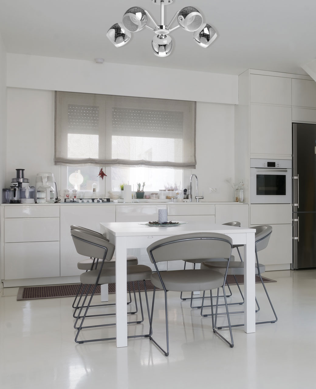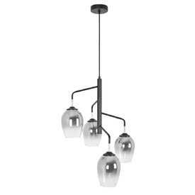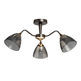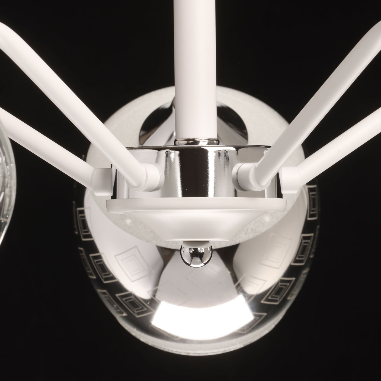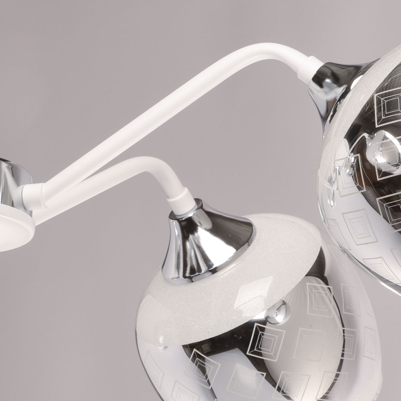 Металлическое основание потолочной люстры окрашено в белый цвет. Отдельные элементы основания гальванизированы в цвет хрома. Выдувные вручную стеклянные плафоны гальванизированы в дымчатый цвет и окрашены в белый цвет по трафарету. Край плафонов оплавлен. С внутренней стороны плафоны декорированы белой стеклянной крошкой.