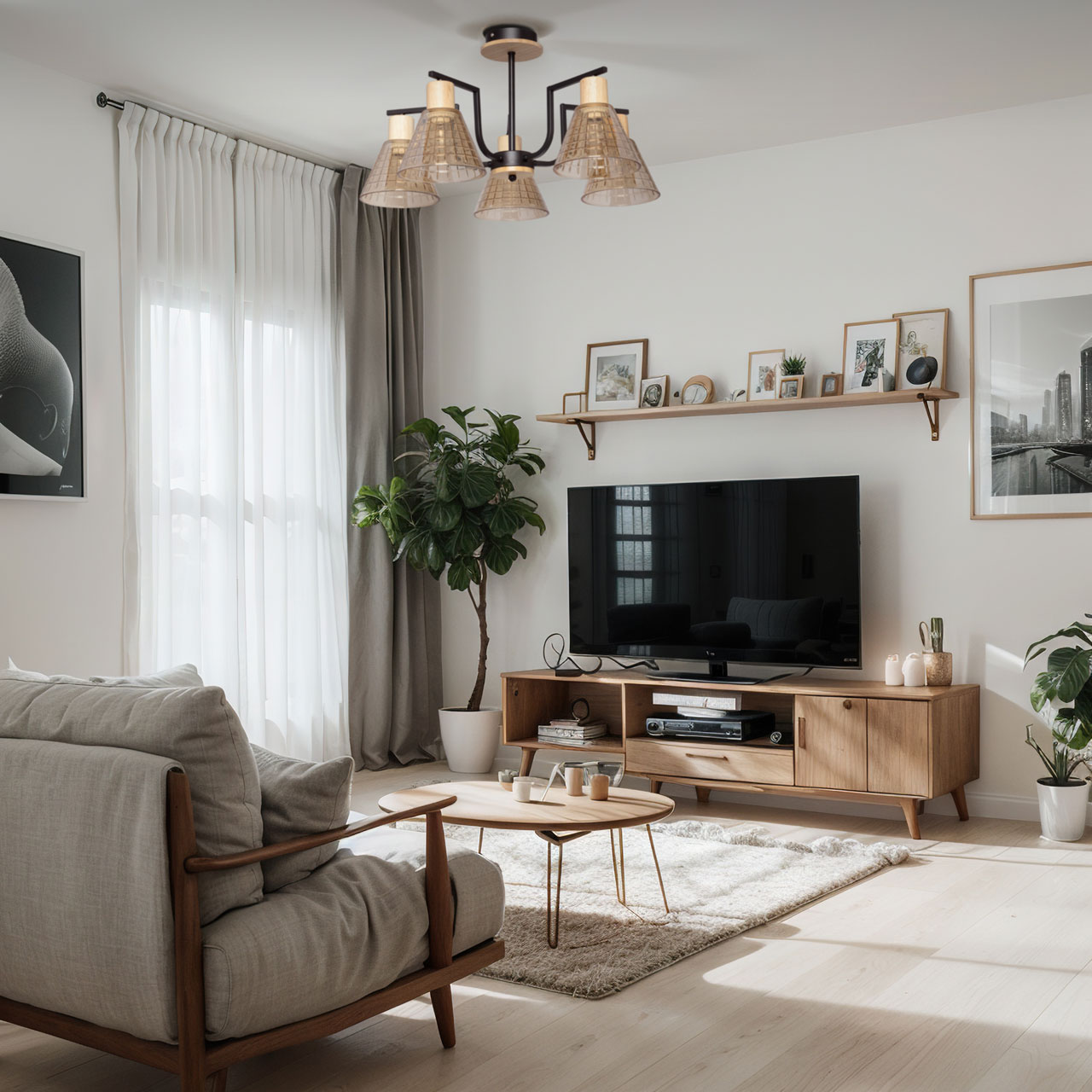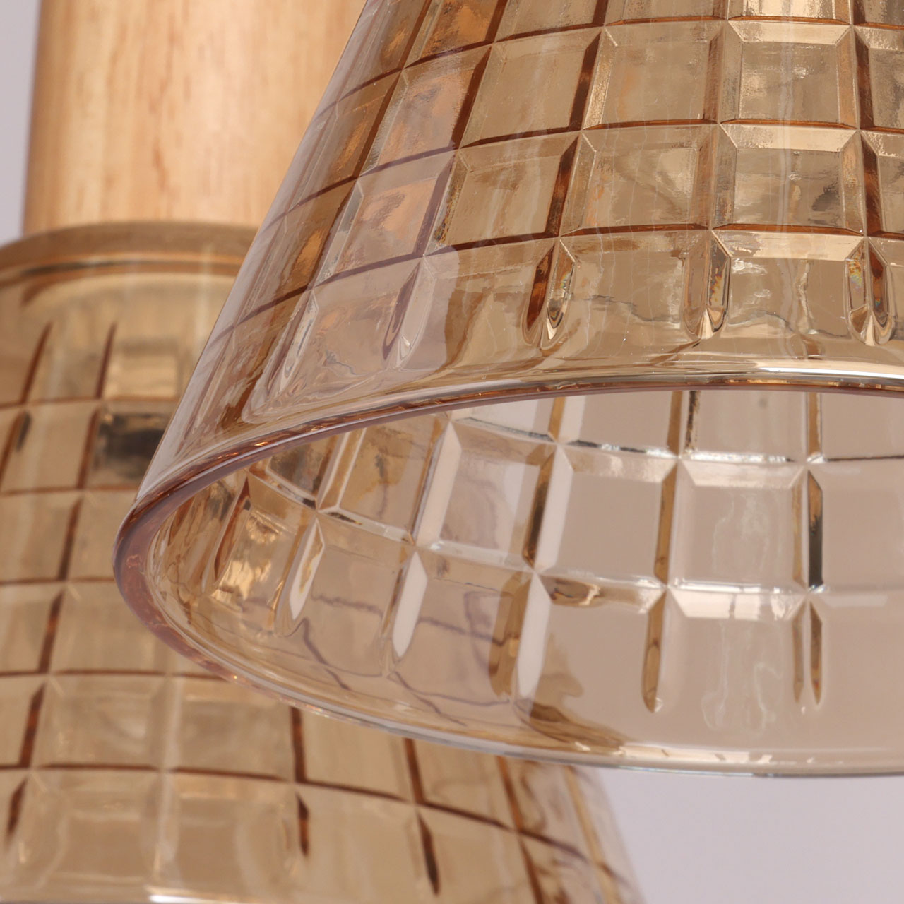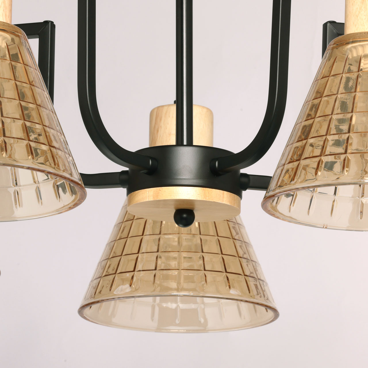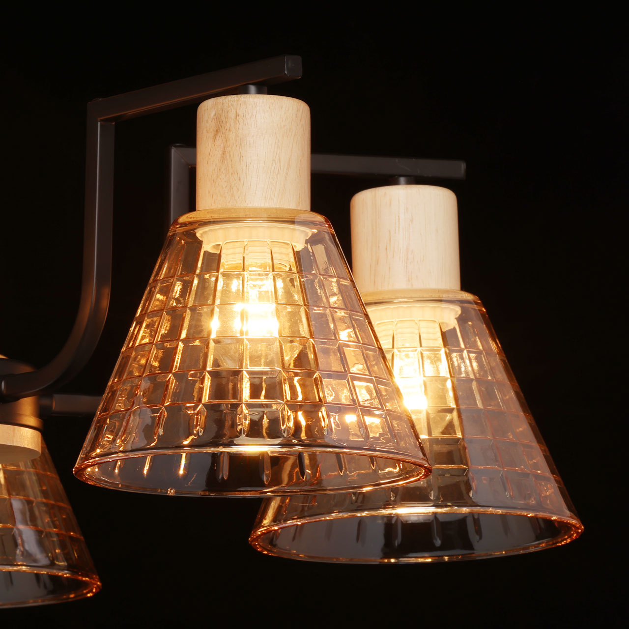 Металлическое основание потолочной люстры окрашено в черный цвет. Стеклянные плафоны отлиты в сложную форму и гальванизированы в цвет шампань. Светильник декорирован элементами из натурального светлого дерева.
