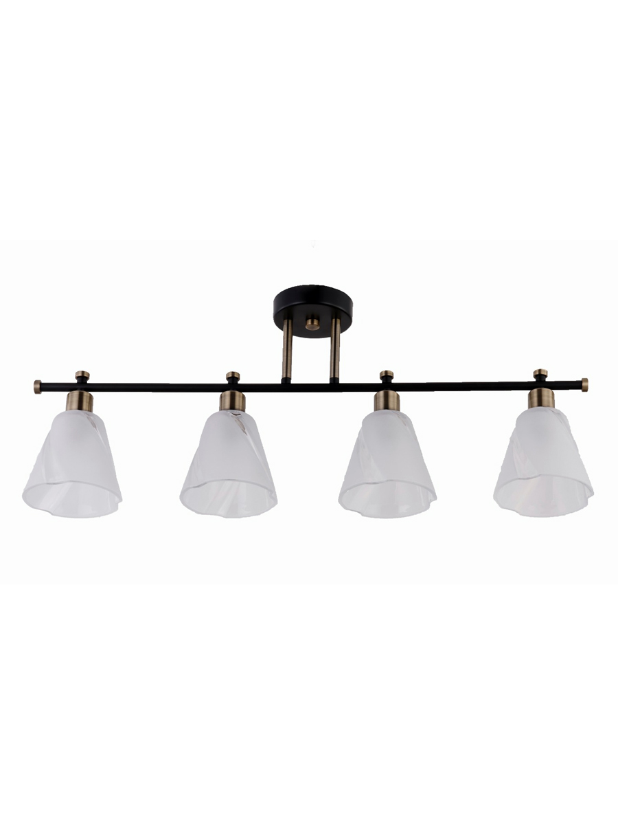 Основание светильника выполнено из металла и окрашено в черный цвет. Отдельные элементы основания гальванизированы в цвет античной бронзы. Стеклянные плафоны отлиты в сложную форму и матированы в белый цвет.