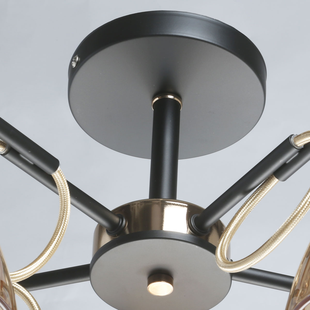Металлическое основание потолочного светильника окрашено в черный цвет. Отдельные элементы гальванизированы в цвет золота. Стеклянные плафоны выдуваются в сложную форму и гальванизированы в цвет шампань