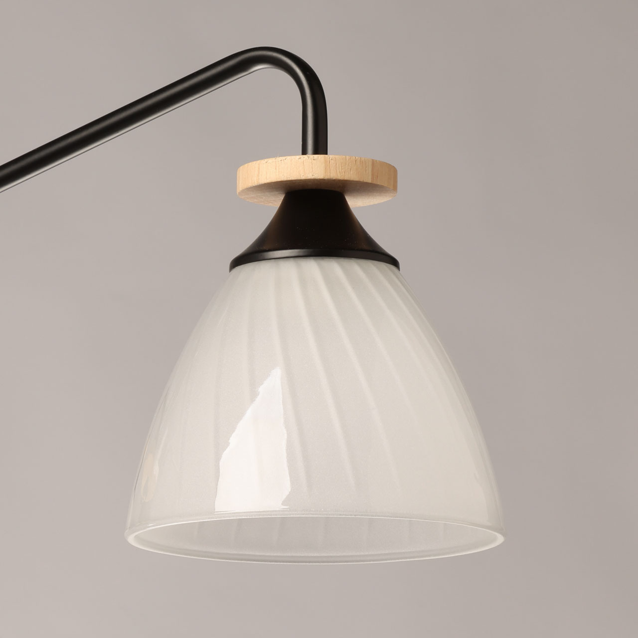 Металлическое основание потолочной люстры окрашено в черный цвет. Стеклянные плафоны отлиты в форму и окрашены в белый цвет с внутренней стороны. Светильник декорирован элементами из натурального светлого дерева.