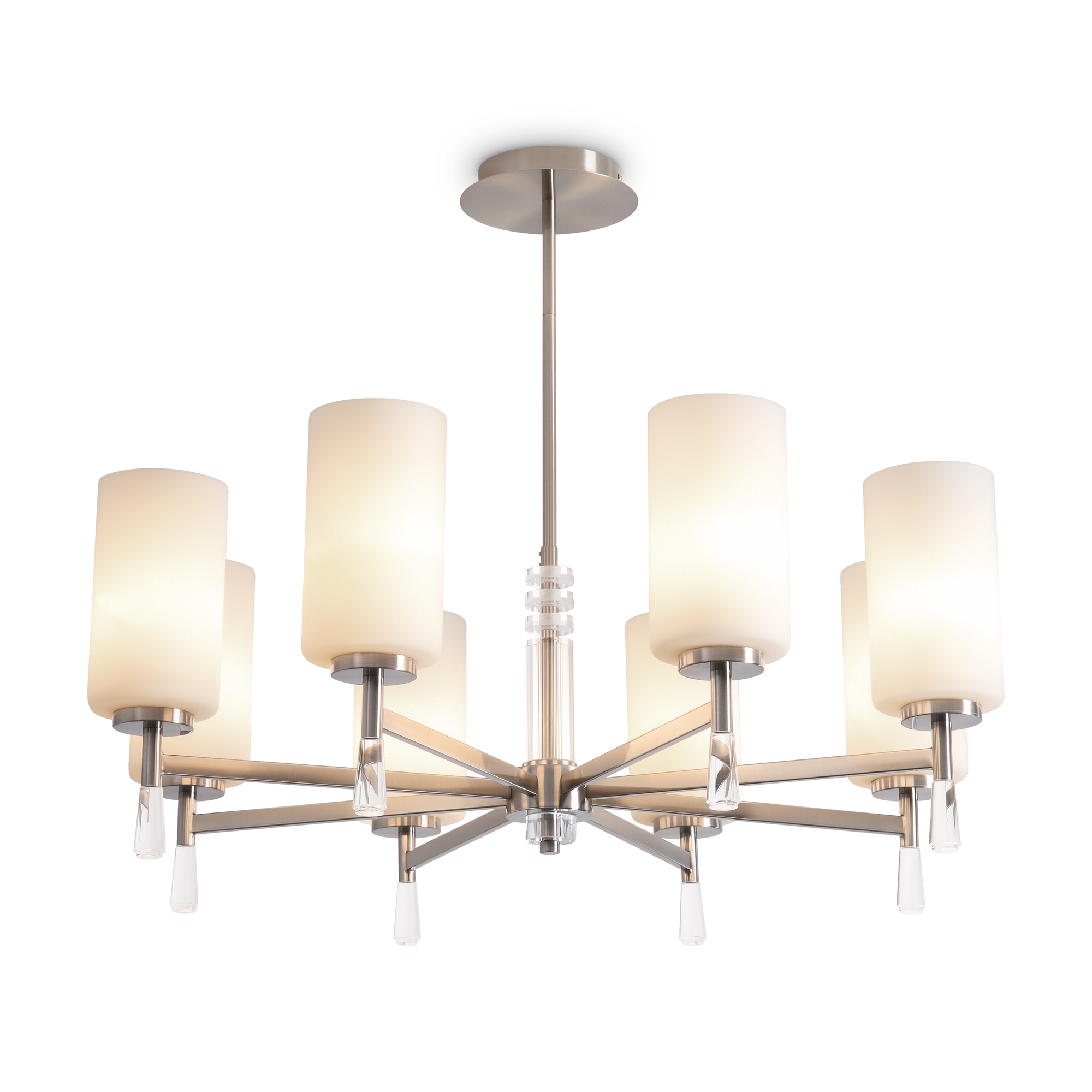 Металлическая арматура: латунь или никель (новинка серии).Белые стеклянные плафоны цилиндрической формы, направленные вверх.. Хрустальное основание с акриловыми каплями. Лампа E27.