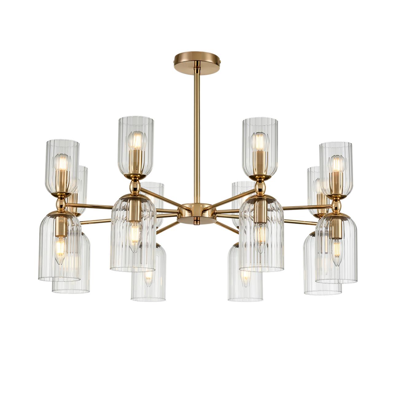 Линия светильников KASSIA станет оригинальным дополнением современных интерьеров. KASSIA сочетает металлический каркас в благородном золотом цвете и цилиндрические плафоны из прозрачного рифленого стекла. Плафоны меньшего размера направлены вверх, плафоны большего размера направлены вниз. Такое дублирование плафонов дает больше света и позволяет осветить большое пространство. В данной серии рекомендуется использование круглых небольших ламп в верхних плафонах и лампы в виде свечи – в нижних. Это добавит оригинальности и легкий ретро-акцент, который гармонично сочетается с современной стилистикой.Потолочные светильники KASSIA на 10 и 16 ламп станут центральным элементом в просторных залах, а утонченные бра дополнят уютную атмосферу вашего дома.