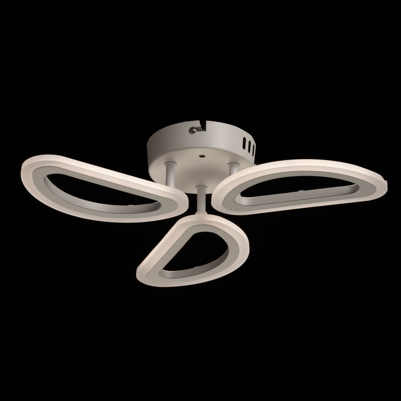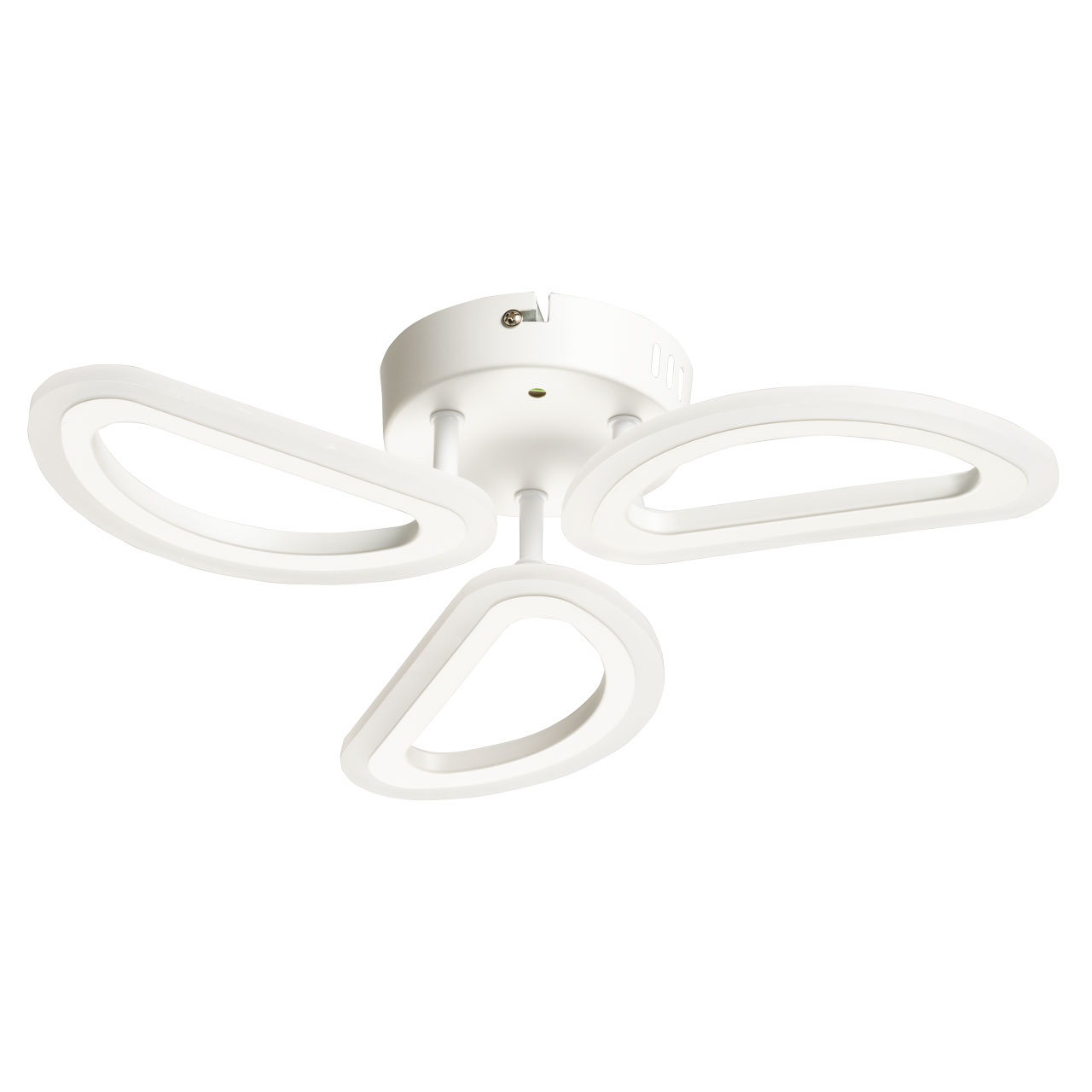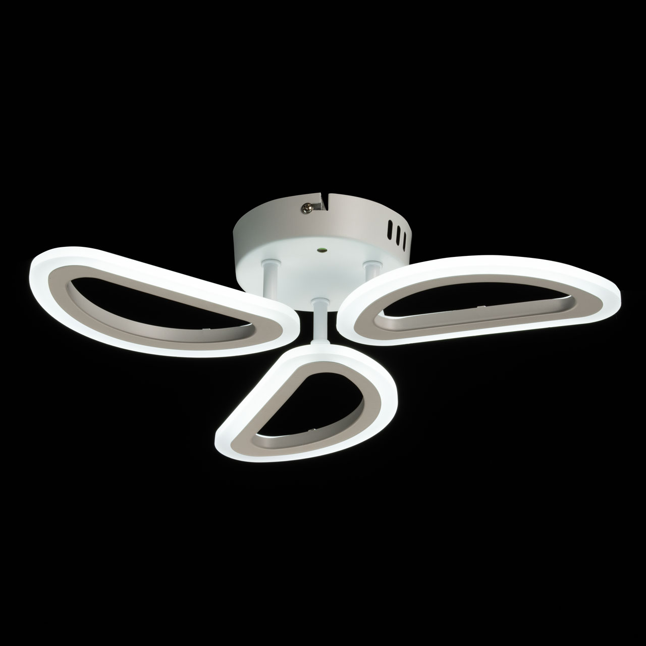 Металлическое основание потолочной люстры окрашено в белый цвет. Корпус плафонов выполнен из сплава алюминия с цинком и окрашен в цвет основания. Светодиодные источники света закрыты белым матовым акрилом.