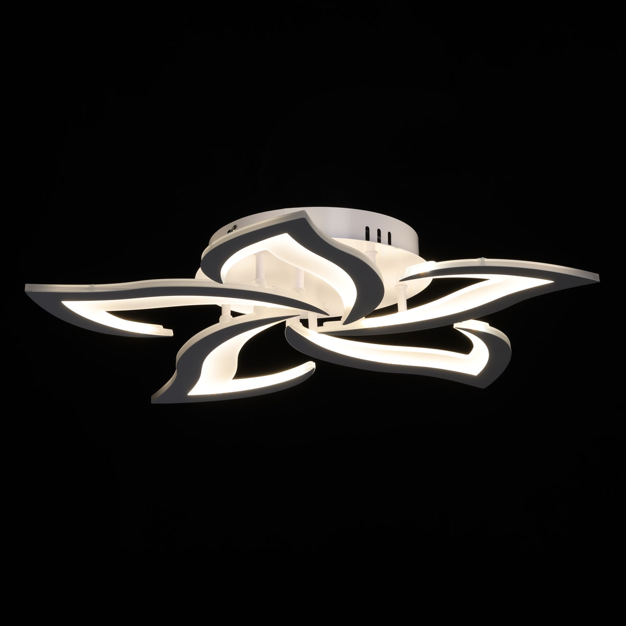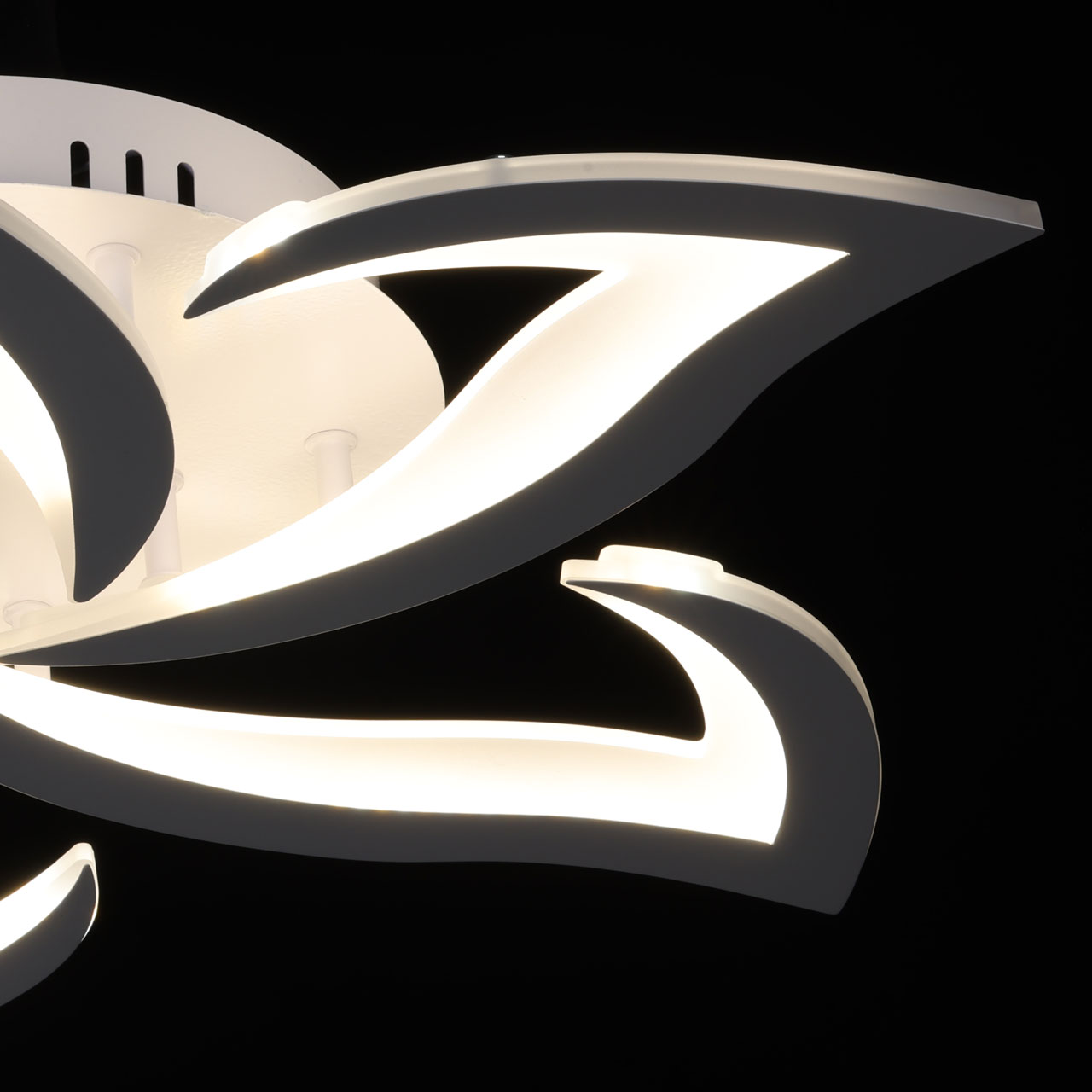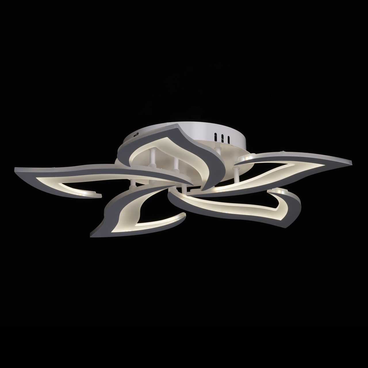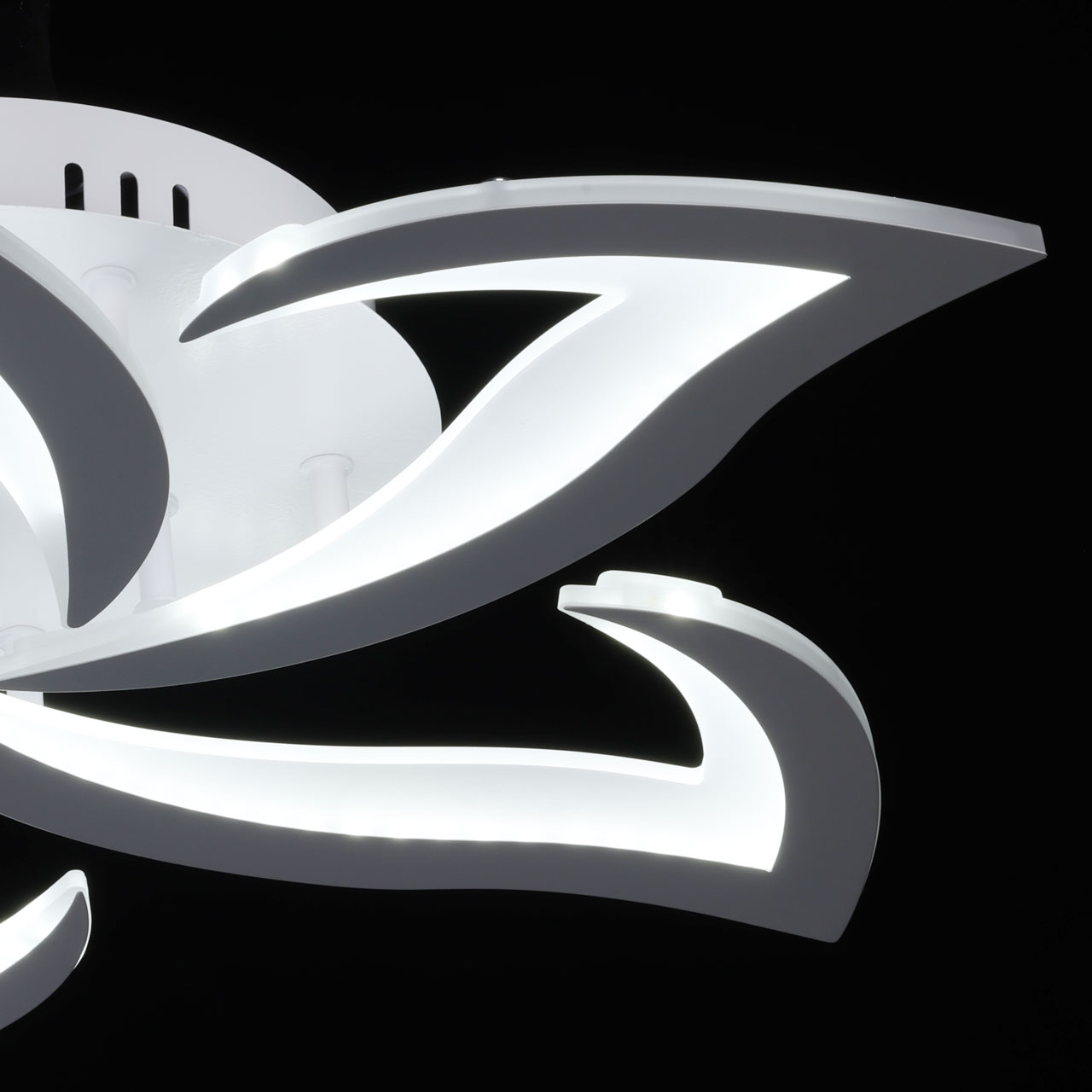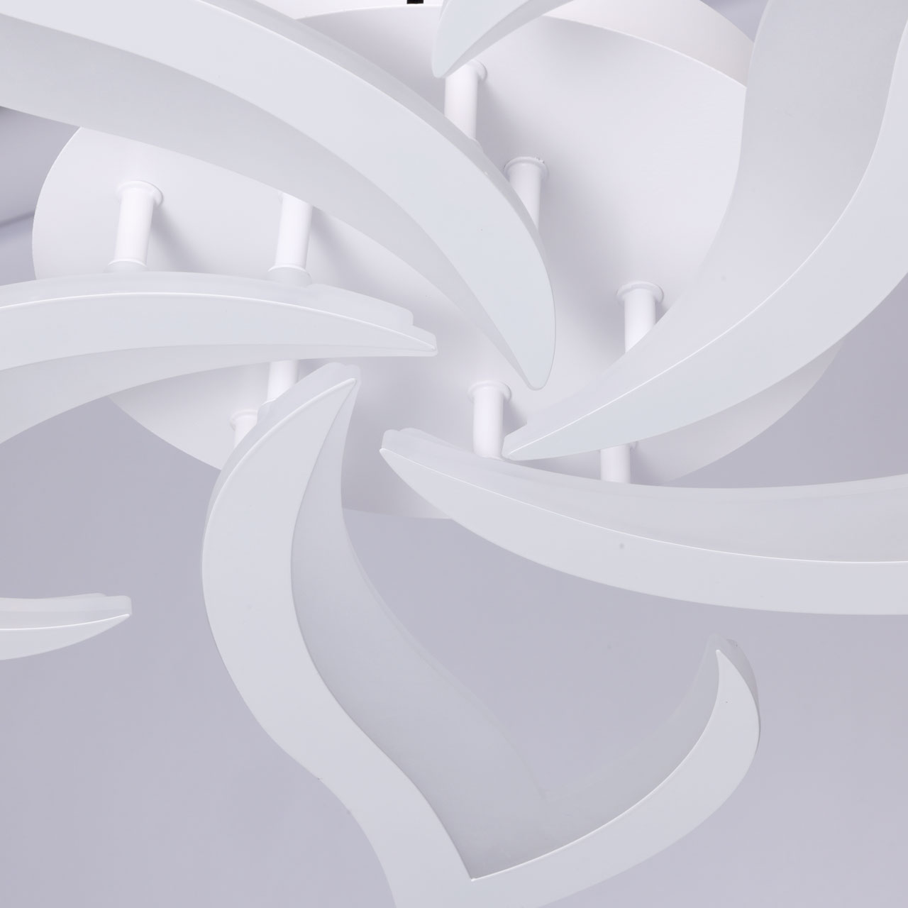 Металлическое основание потолочной люстры окрашено в белый цвет. Корпус плафона выполнен из сплава алюминия с цинком и окрашен в цвет основания. Светодиодный источник света закрыт матовым акрилом.