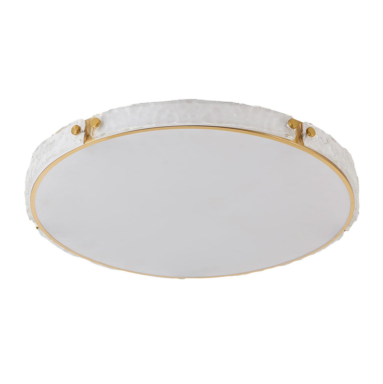 Металлическое основание потолочной люстры гальванизировано в цвет латуни. Светодиодный источник света закрыт белым матовым акрилом. Плафон люстры декорирован прозрачным фактурным стеклом.