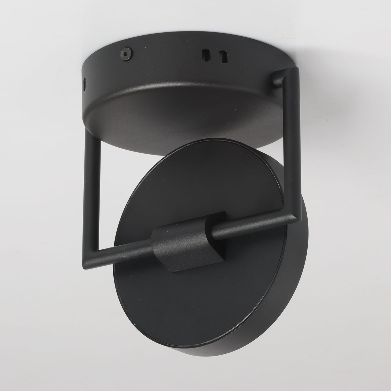 Металлическое основание потолочного светильника обработано по технологии порошкового окрашивания в черный цвет. Светодиодные источники света закрыты белым матовым акрилом.