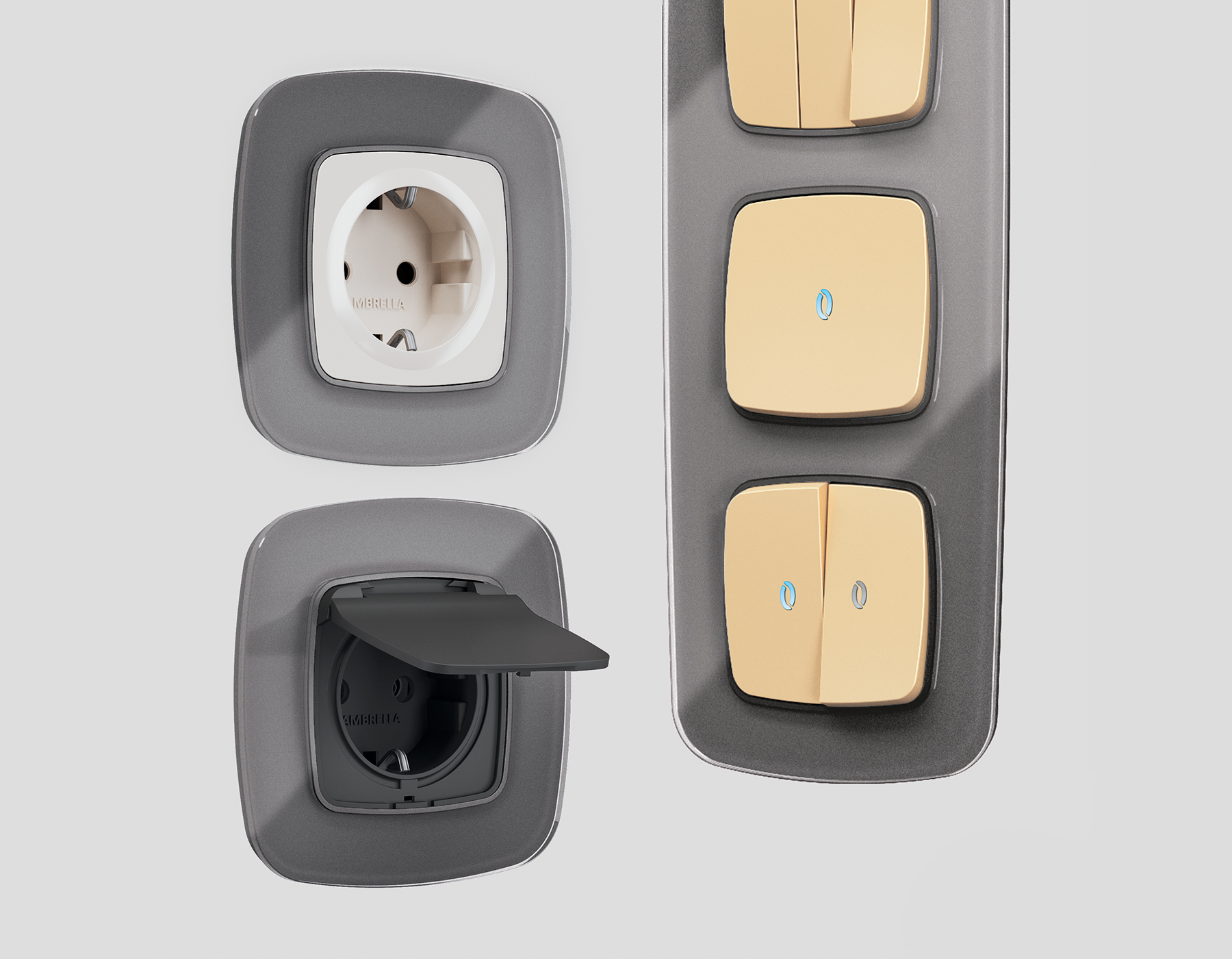 Многогранный ассортимент Ambrella Volt включает в себя механизмы, лицевые панели и рамки, а также комплекты, доступные в различных цветовых решениях. Продукция представлена в модульном исполнении, что позволяет гибко настраивать внешнийвид и функциональность. Вам будет легко заменить лицевую панель, рамку или механизм, найдя идеальное сочетание цветов.
