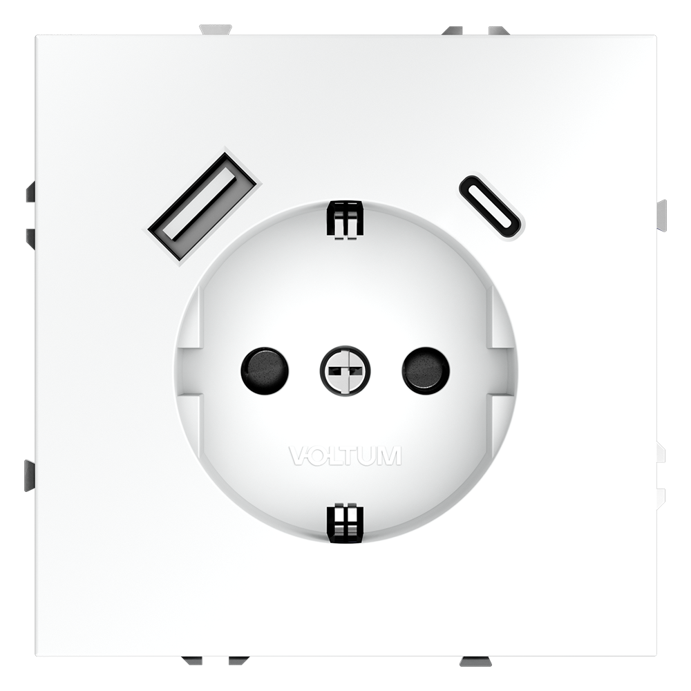 Купить "Розетка встраиваемая с заземлением и защитными шторками, 16А, с USB, A+С Voltum S70 VLS040502 (белый матовый)"