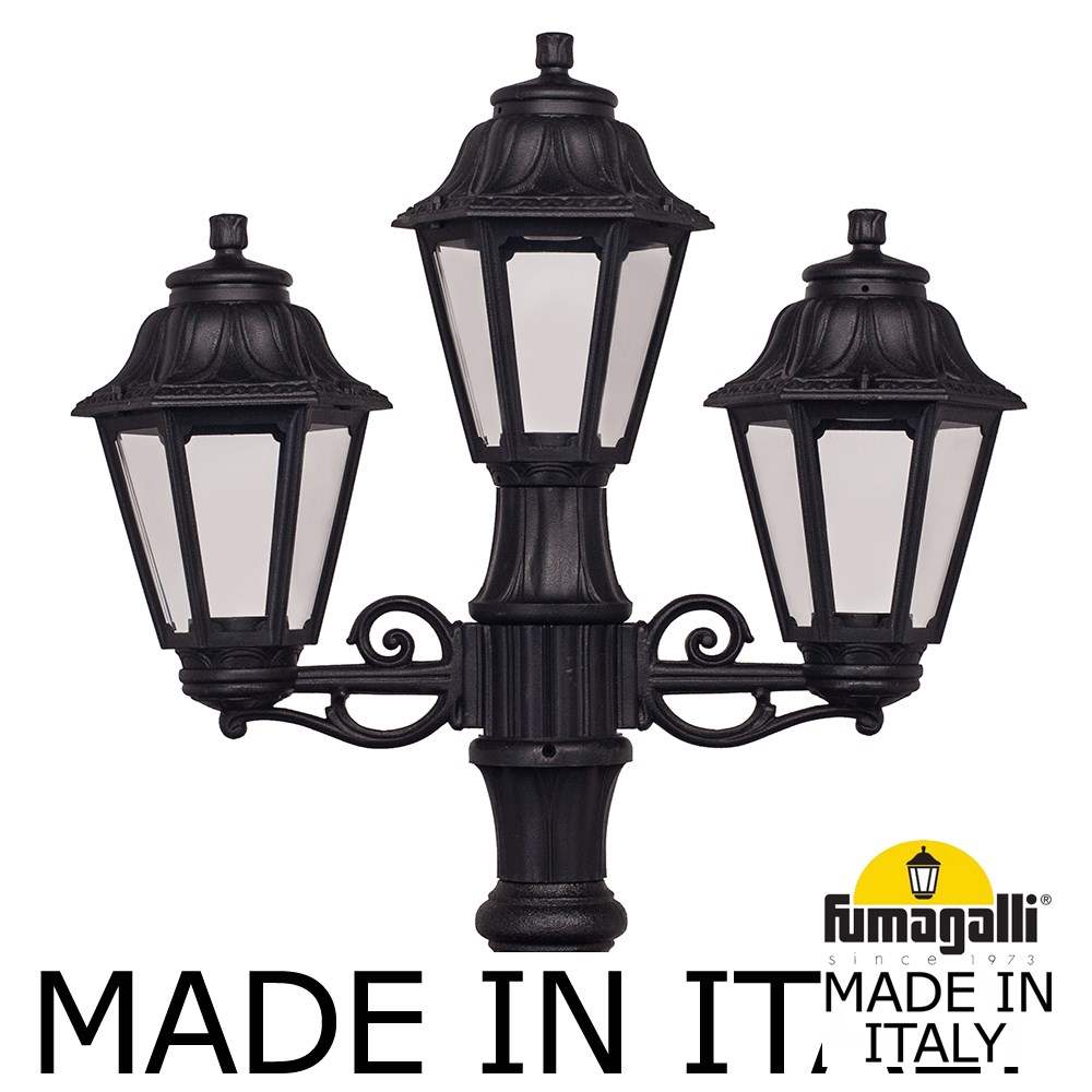 Садово-парковый фонарь FUMAGALLI серии ANNA, модель ANNA/ARTU/BISSO 2+1. Парковый торшер, столб ARTU с двумя уличными фонарямиANNA на двух малых консолях BISSO и одним светильником на опоре. По форме напоминает "трезубец". Используются для архитектурного и ландшафтного освещения в стиле "классика". Место установки столбиков освещения - парковые дорожки, cкверы, садовые участки, тротуары, а так же ландшафтные и архитектурные объекты. Могут устанавливаться и внутри помещений в качестве декоративных уличных фонарей. Изготовлены в Италии, по уникальным технологиям "FUMAGALLI" из современного композитного полимера RESIN. Этот материал в 5 раз прочнее металла, не ржавеет, не окисляется, не выгорает на солнце, его не нужно красить. Все светильники пыле-влаго защищены по стандарту IP55 (защита от пыли, защита от струй воды, падающих под любым углом). Рассеиватель выполнен из антивандального, не мутнеющего и не горючего PMMA (ПолиМетилМетаАкрилат). Срок службы светильника - не менее 20 лет. Температура использования от -60 до +90. В серии ANNA есть фонари в настенном (BISSO/ANNA, PORPORA/ANNA) подвесном (SICHEM/ANNA, SICHEM/ANNA 3L) и наземном исполнении (IAFAET.R/ANNA, ALOE.R/ANNA, ARTU/ANNA, GIGI/ANNA, RICU/ANNA, RICU/ISSO/ANNA 1L, RICU/ISSO/ANNA 2L, RICU/ISSO/ANNA 3L) со столбами разной высоты, с разным количеством и конфигурацией голов. Консоли настенных фонарей и кронштейны светильников на столбах освщения могут устанавливаться вверх/вниз. Столбы выше 150 см имеют в основе мощную стальную трубу с двойной оцинковкой. При заказе требуется выбрать цвет корпуса, цвет плафона и тип патрона (Е-27 или LED GX-53). Возможен светодиодный вариант. По стилю и дизайну серия уличных светильников ANNA похожа на светильники среднего размера серии RUT и на светильники большого размера серии NOEMI. По размеру ANNA относится к малым светильникам как серия SABA и GLOBE 250.
