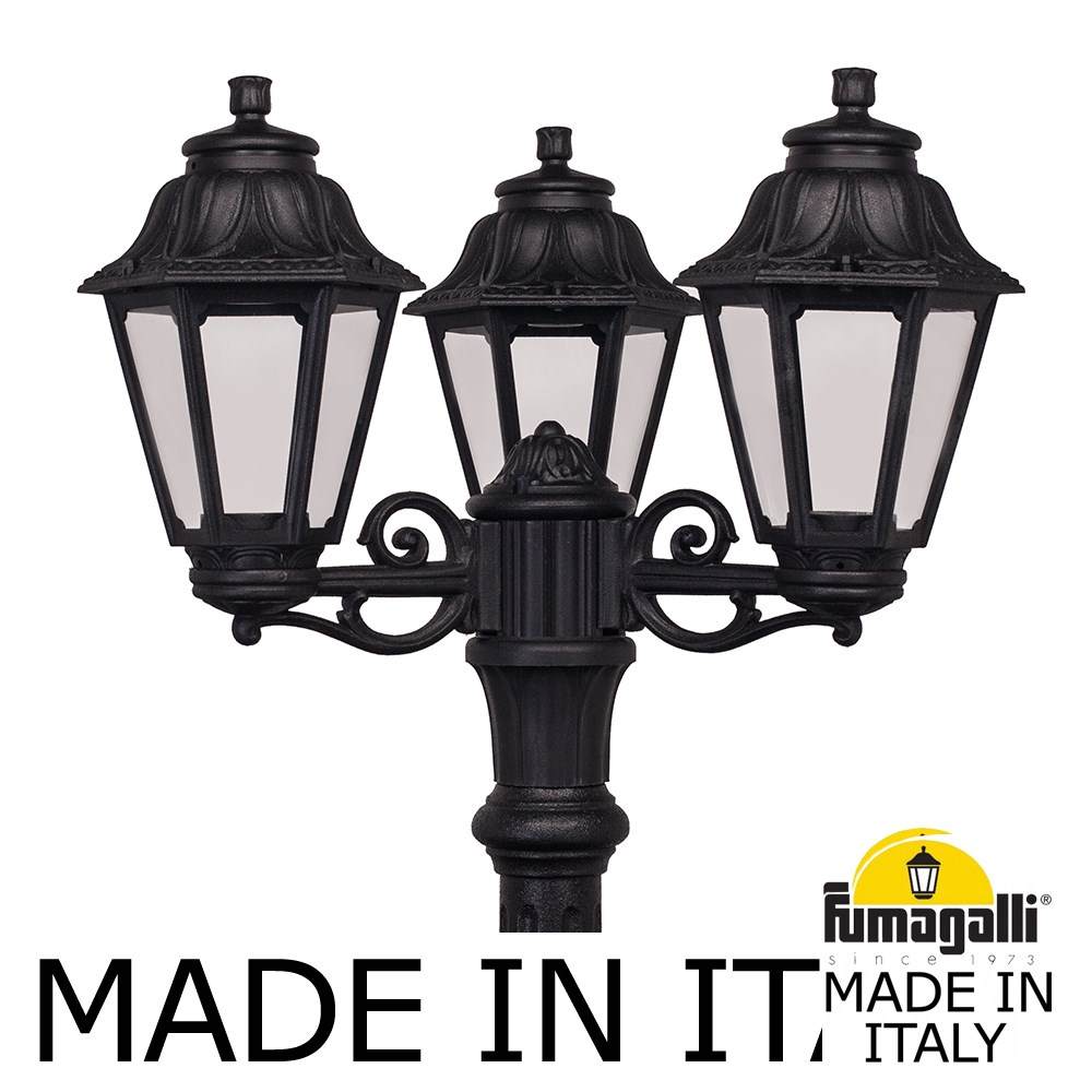 Садово-парковый фонарь FUMAGALLI серии ANNA, модель ANNA/ARTU/BISSO 3L. Парковый торшер, столб ARTU с тремя уличными фонарями ANNA на малых консолях BISSO. Используются для архитектурного и ландшафтного освещения в стиле "классика". Место установки столбиков освещения - парковые дорожки, cкверы, садовые участки, тротуары, а так же ландшафтные и архитектурные объекты. Изготовлены в Италии, по уникальным технологиям "FUMAGALLI" из современного композитного полимера RESIN. Этот материал в 5 раз прочнее металла, не ржавеет, не окисляется, не выгорает на солнце, его не нужно красить. Все светильники пыле-влаго защищены по стандарту IP55 (защита от пыли, защита от струй воды, падающих под любым углом). Рассеиватель выполнен из антивандального, не мутнеющего и не горючего PMMA (ПолиМетилМетаАкрилат). Срок службы светильника - не менее 20 лет. Температура использования от -60 до +90. В серии ANNA есть фонари в настенном (BISSO/ANNA, PORPORA/ANNA) подвесном (SICHEM/ANNA, SICHEM/ANNA 3L) и наземном исполнении (IAFAET.R/ANNA, ALOE.R/ANNA, ARTU/ANNA, GIGI/ANNA, RICU/ANNA, RICU/ISSO/ANNA 1L, RICU/ISSO/ANNA 2L, RICU/ISSO/ANNA 3L) со столбами разной высоты, с разным количеством и конфигурацией голов. Консоли настенных фонарей и кронштейны светильников на столбах освщения могут устанавливаться вверх/вниз. Столбы выше 150 см имеют в основе мощную стальную трубу с двойной оцинковкой. При заказе требуется выбрать цвет корпуса, цвет плафона и тип патрона (Е-27 или LED GX-53). Возможен светодиодный вариант. По стилю и дизайну серия уличных светильников ANNA похожа на светильники среднего размера серии RUT и на светильники большого размера серии NOEMI. По размеру ANNA относится к малым светильникам как серия SABA и GLOBE 250.